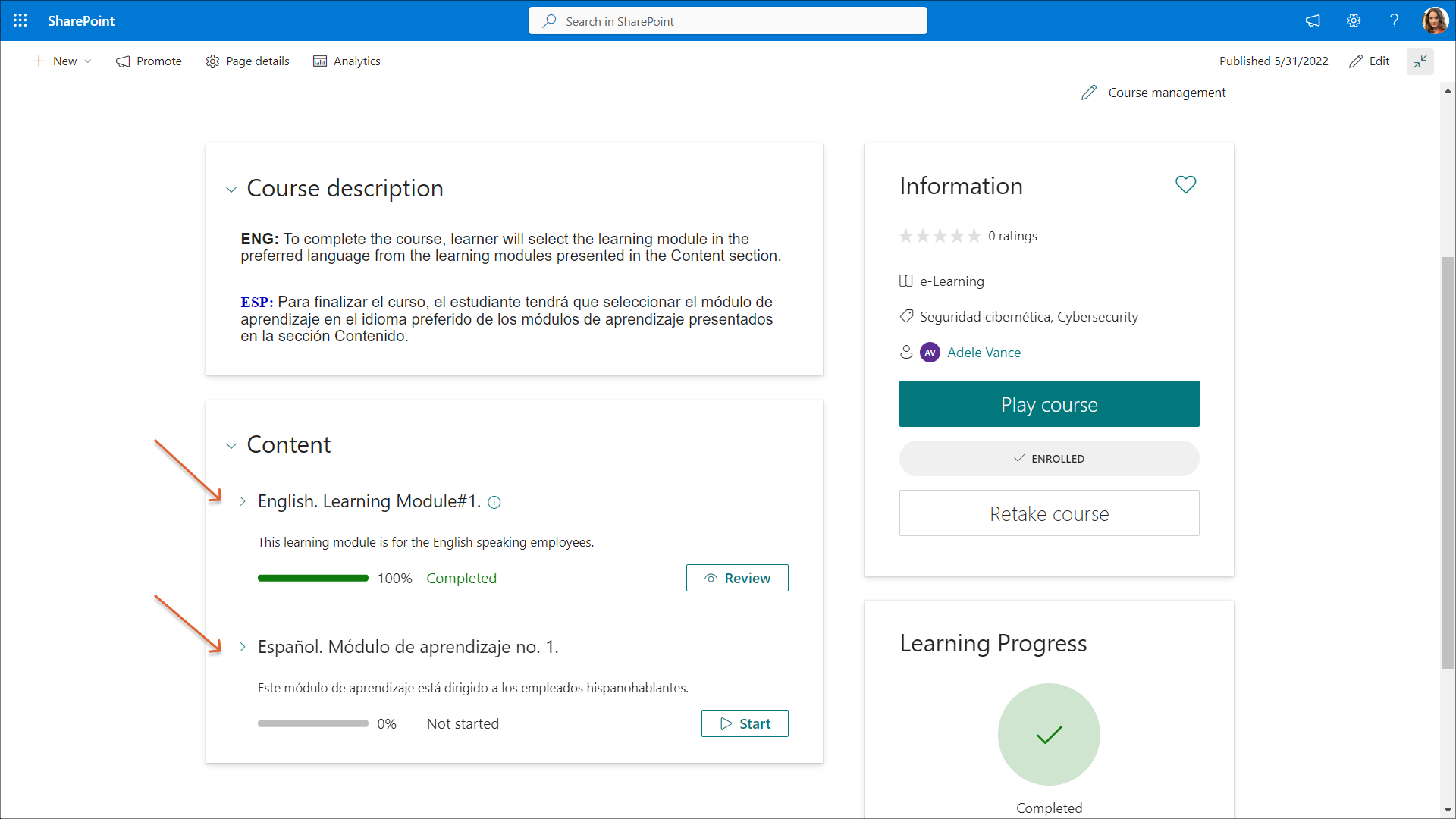 The course in the following image consists of two learning modules—one in English and one in Spanish. From the course home page, learners can select the learning module in their preferred language.