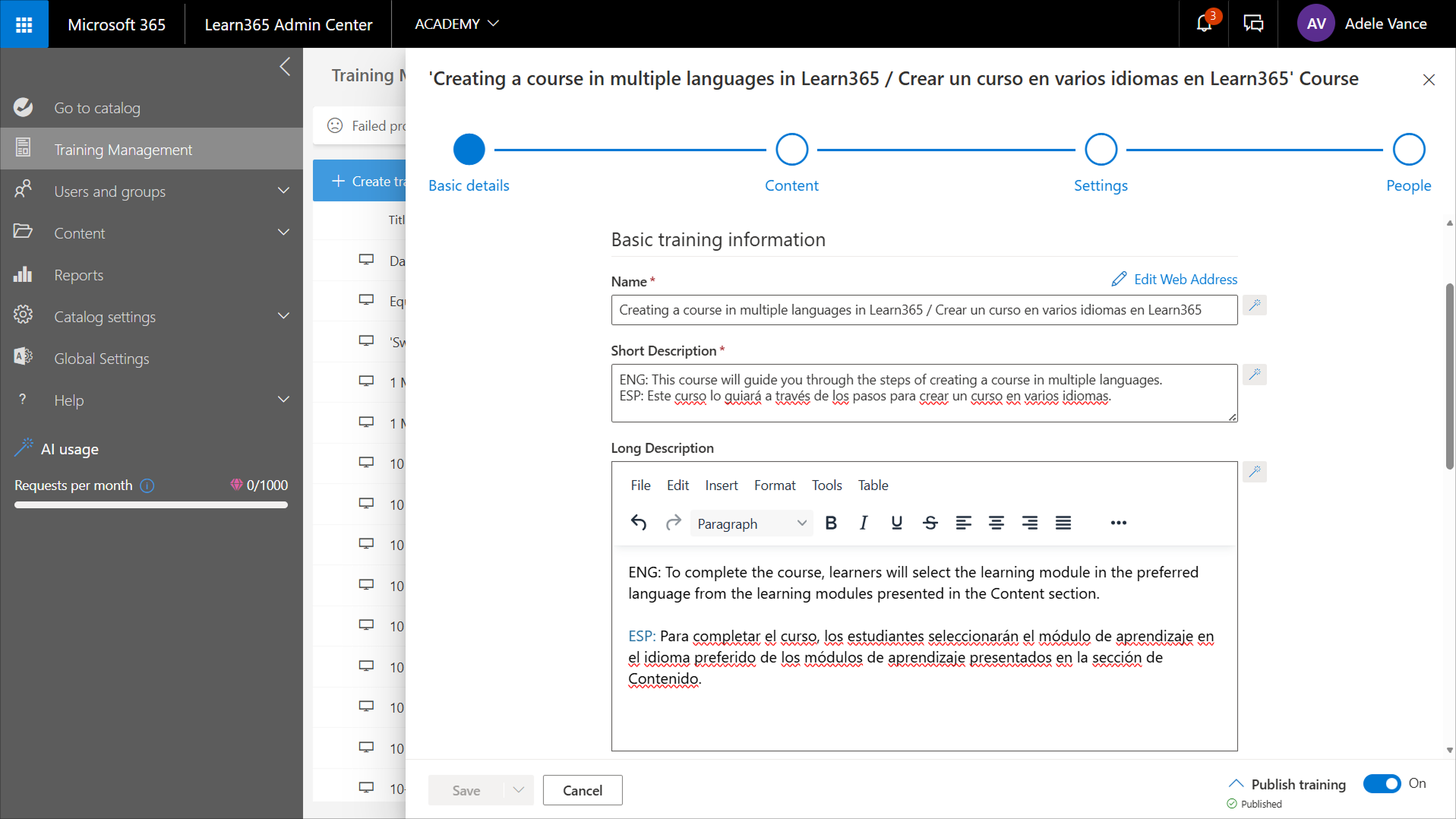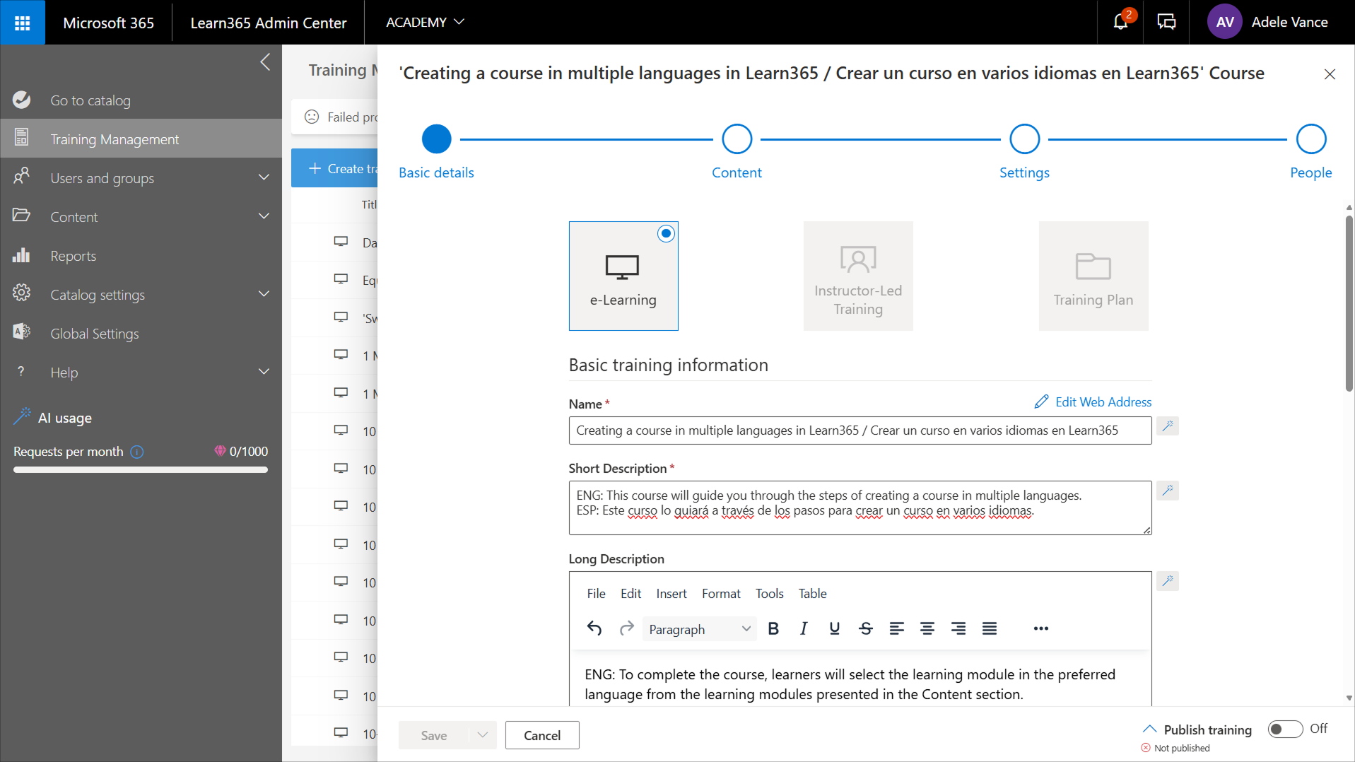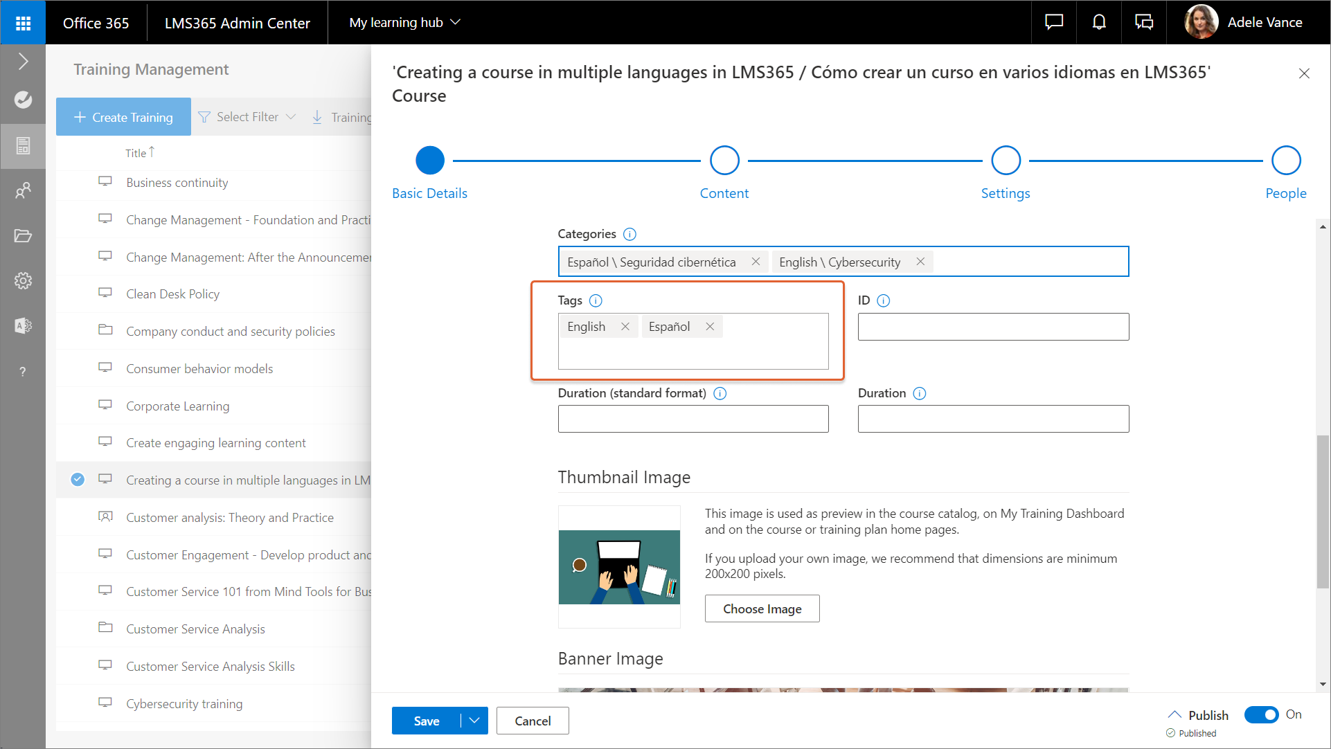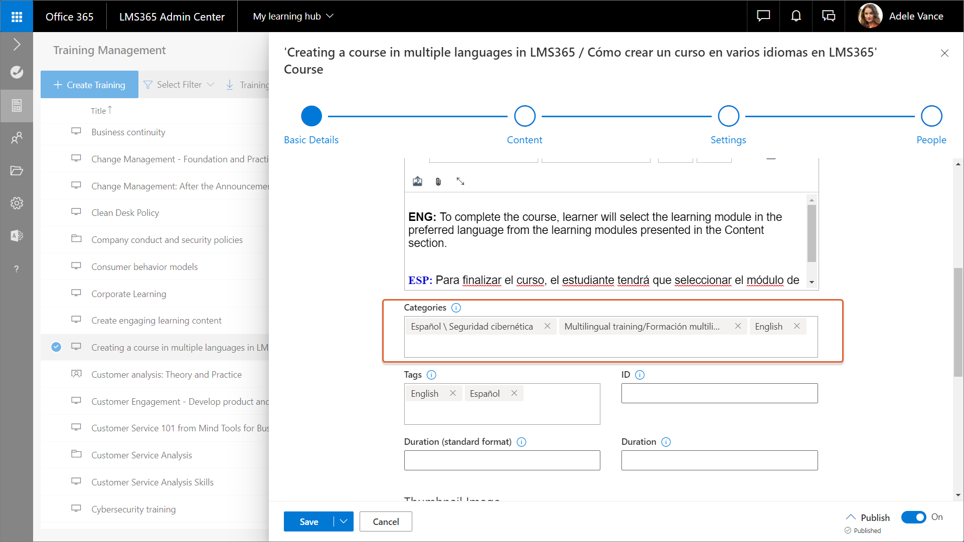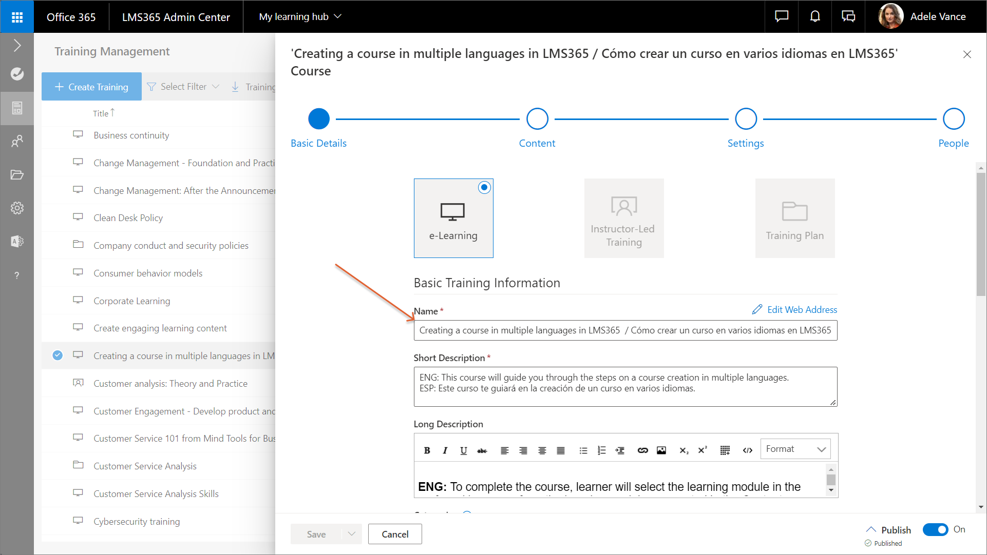 - If you don't have sufficient space in the Name field to enter the course name in all the relevant languages, you can enter the course name in the organization's international language (for example, in English). You can help learners find the relevant training by tagging the course in multiple languages, adding categories for multiple languages, entering the course description in multiple languages, and naming each learning module in the relevant language.