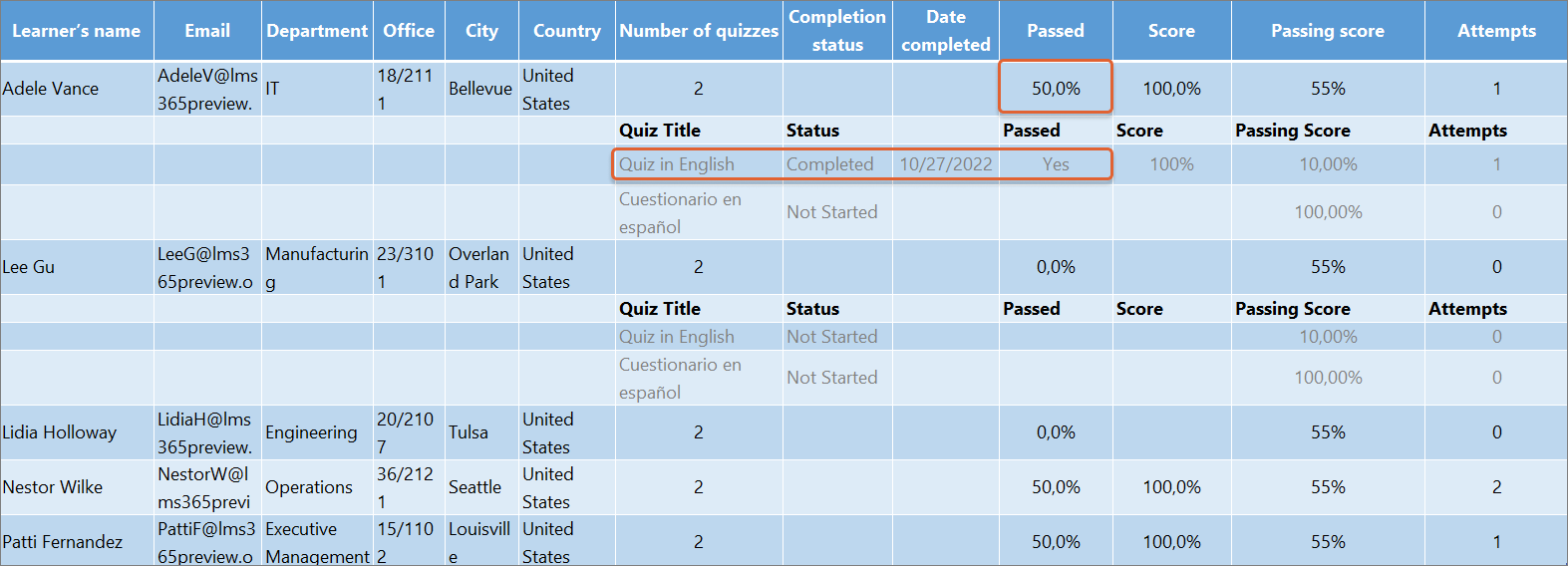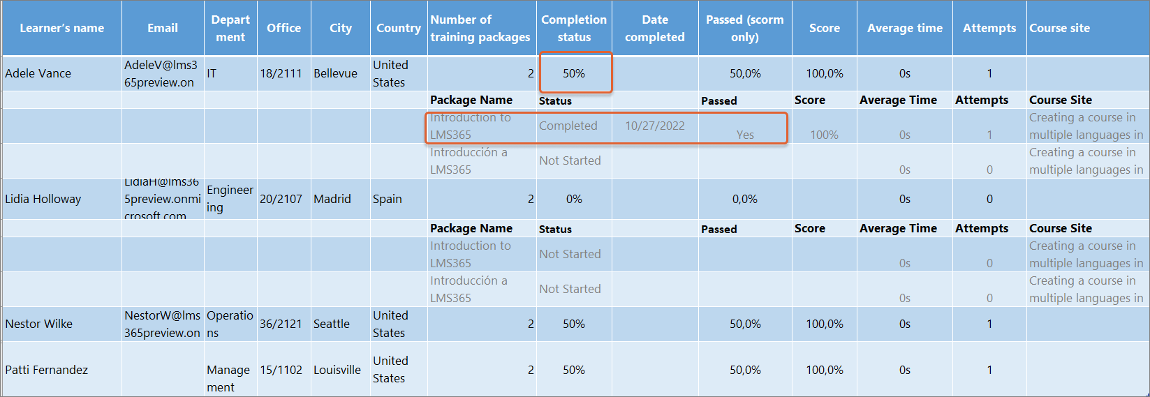 In a course with two learning modules (English and Spanish), Adele Vance has completed the course by completing the learning module in English, and Lidia Holloway has completed the course by completing the learning module in Spanish. They both have 50% in the Passed column because this is an average calculation of the two learning modules in the course, even though they both completed the course and the required learning module.