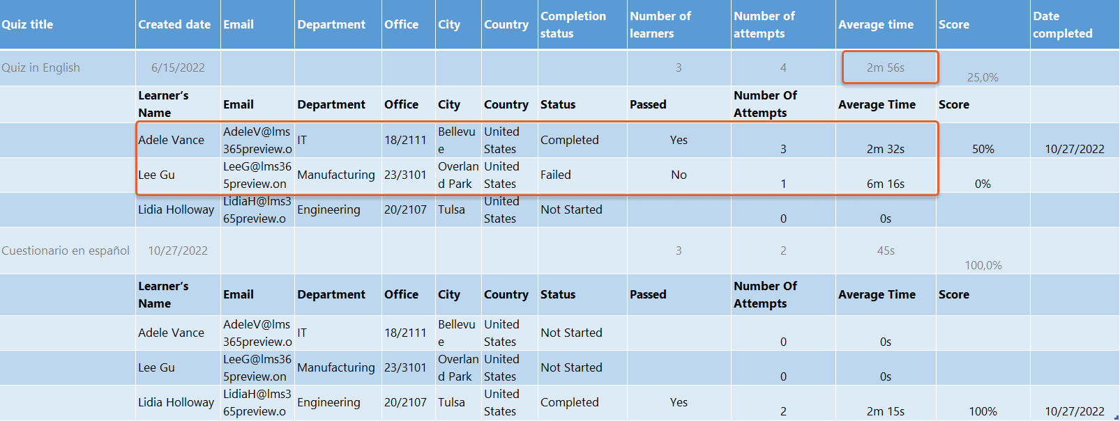 In the following image, only two learners have the statuses Completed and Failed for the quiz in English. However, the Average Time calculation for the quiz includes the learner who has the Not Started status.