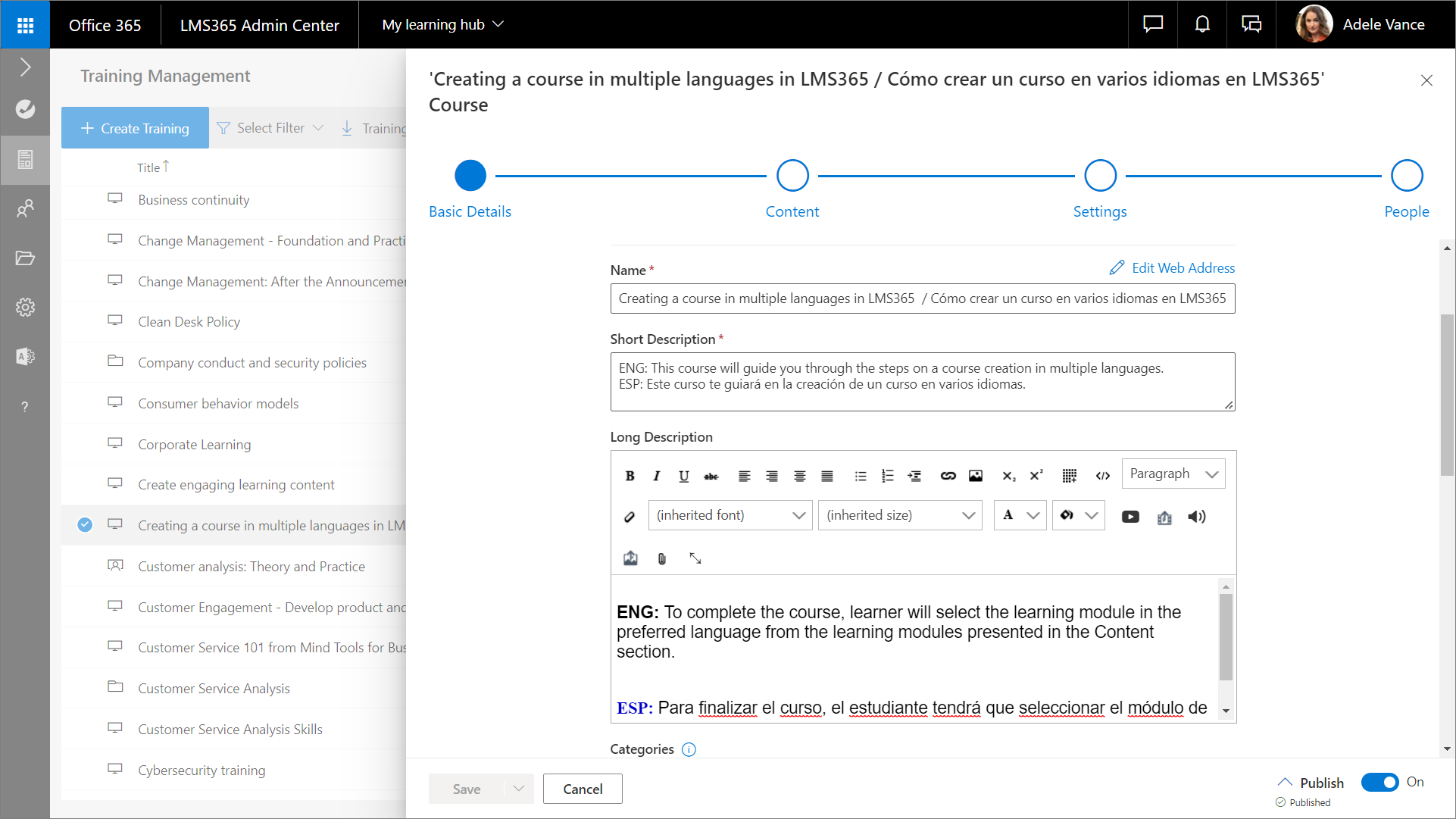 Creating a multilingual course follows the standard course creation flow but you need to pay special attention to the following sections.