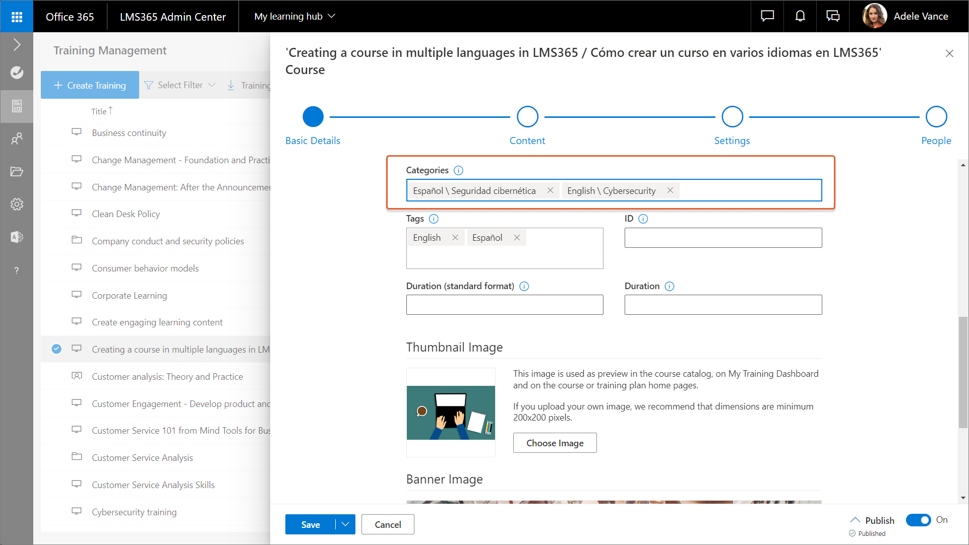 Clear categorization helps ensure custom Learn365 course catalog pages only display relevant courses and training plans. It also proves helpful when managing multilingual courses in the course catalog. For more information, see this article on creating, editing, and managing categories.