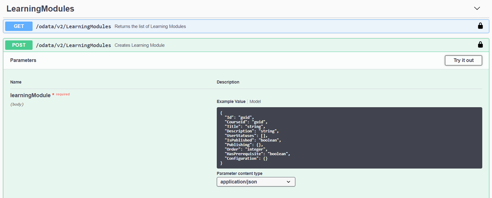 Expand it and find the request POST /odata/v2/LearningModules with the Creates Learning Module description.