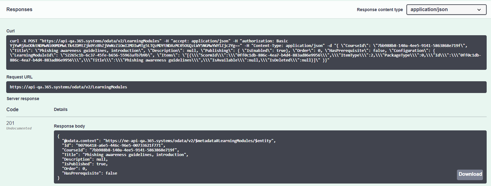 - In the Response body field, you can see the details about the SCORM being successfully added to the learning module.