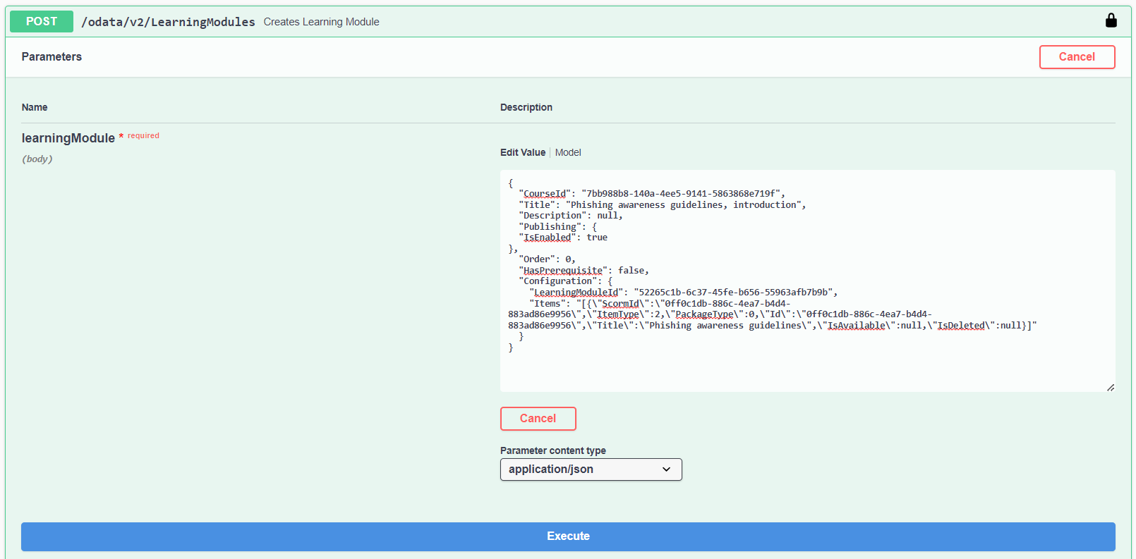 Adding a SCORM content package to a learning module within a course is done in Swagger, following the steps below: