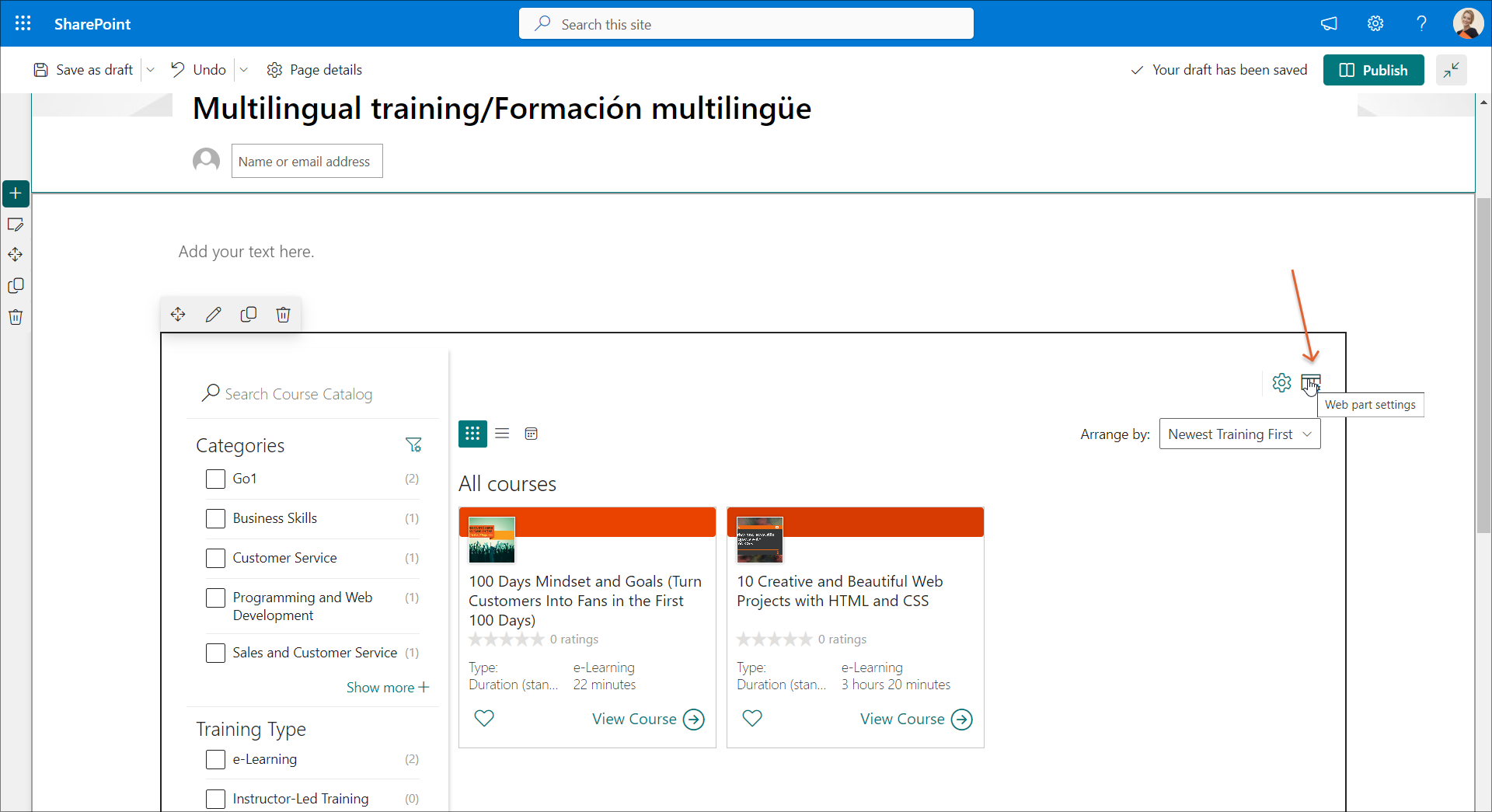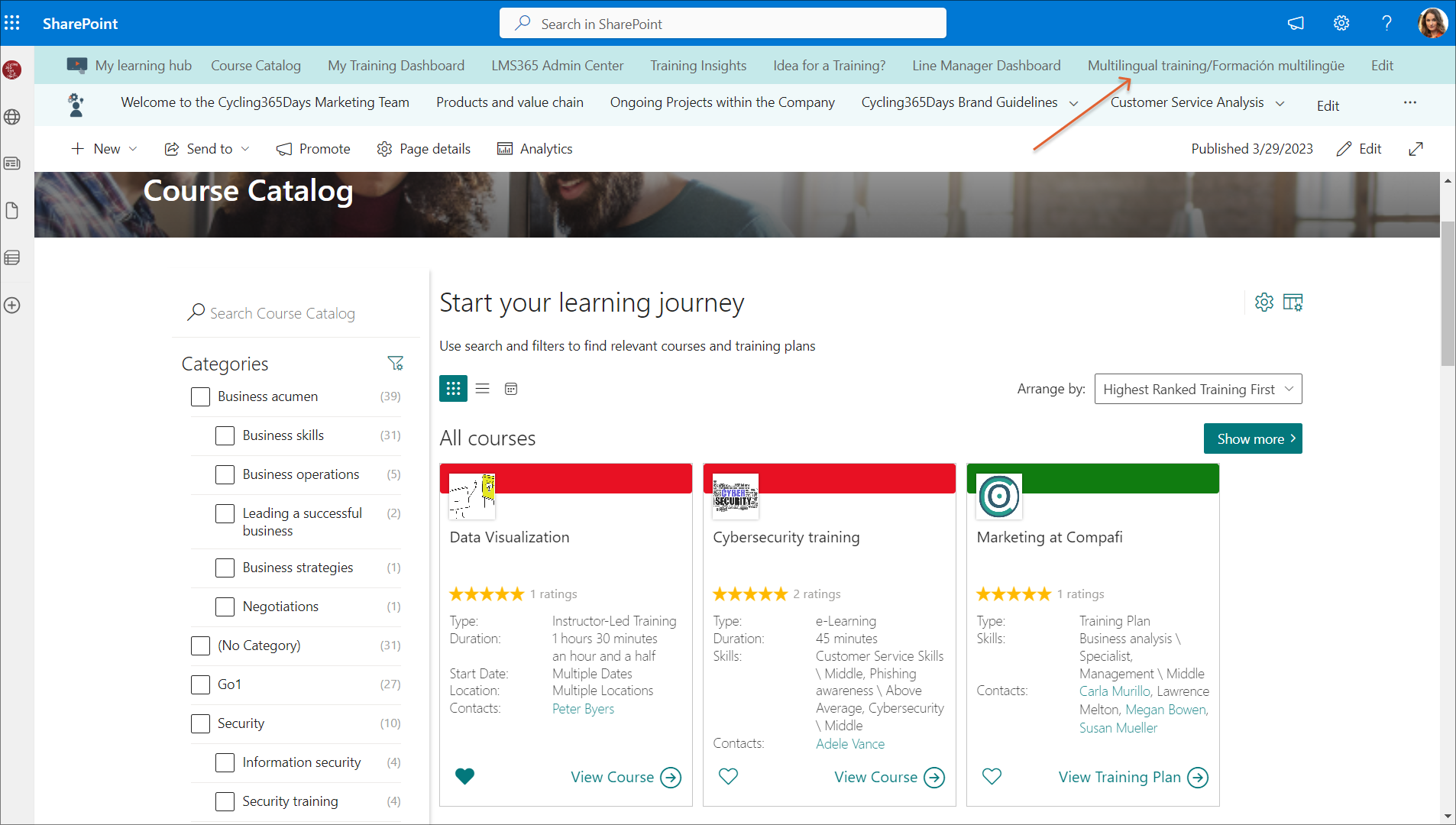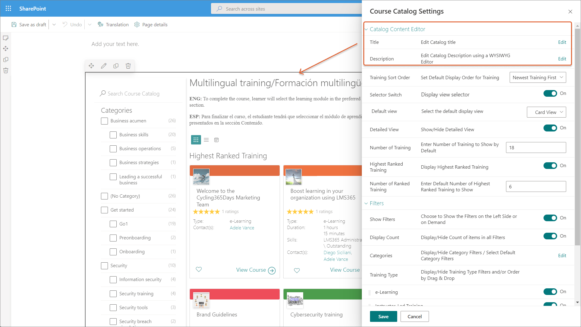 Customized pages are practical when there are complex scenarios in an organization where, for example, a multilingual approach is required. This will enable you to create a specific course catalog page for each language your training is available in and only feature courses and training plans of the same language on each course catalog page, or you can create a specific course catalog page where you only show training that is available in multiple languages.