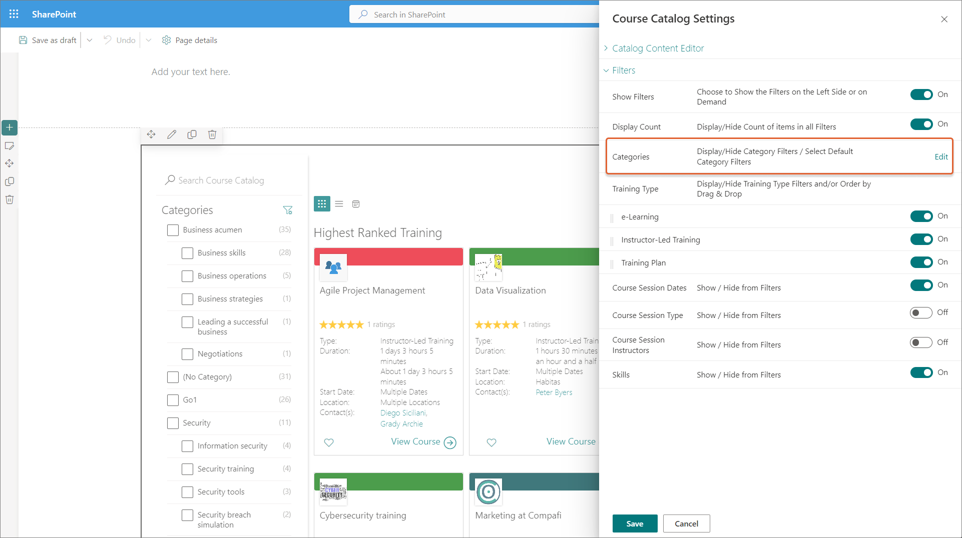 7. On the Course Catalog Settings page, select Save to apply the settings to the customized LMS365 Course Catalog web part.