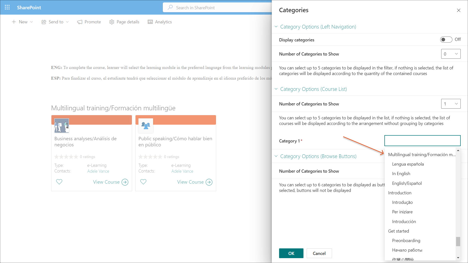 To be able to create a custom Learn365 course catalog page for multilingual courses as in this example case, you need to categorize courses and training plans in your course catalog to be able to sort them in accordance with the languages they are available in. For more information on how to manage categories, refer to this article.