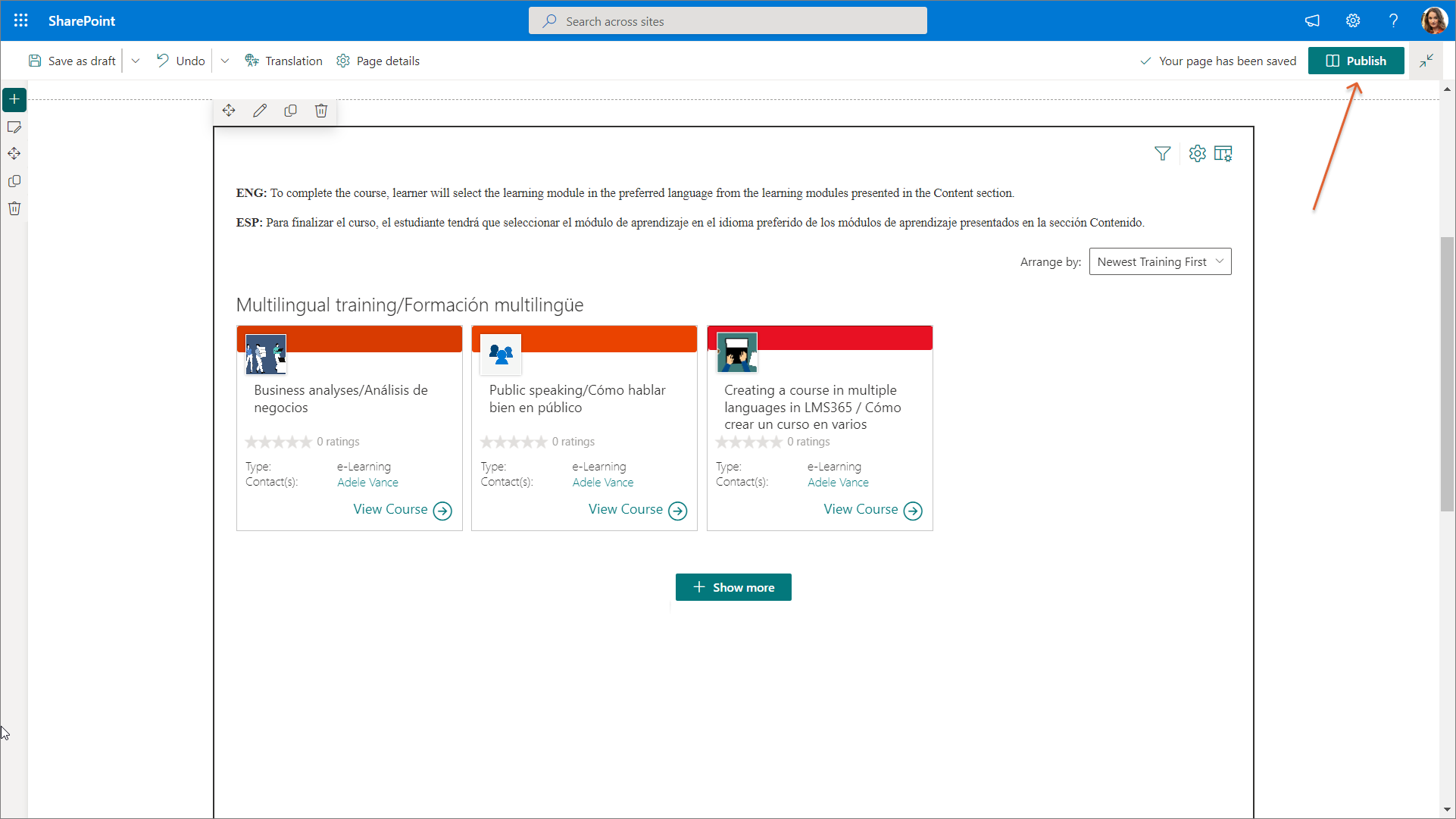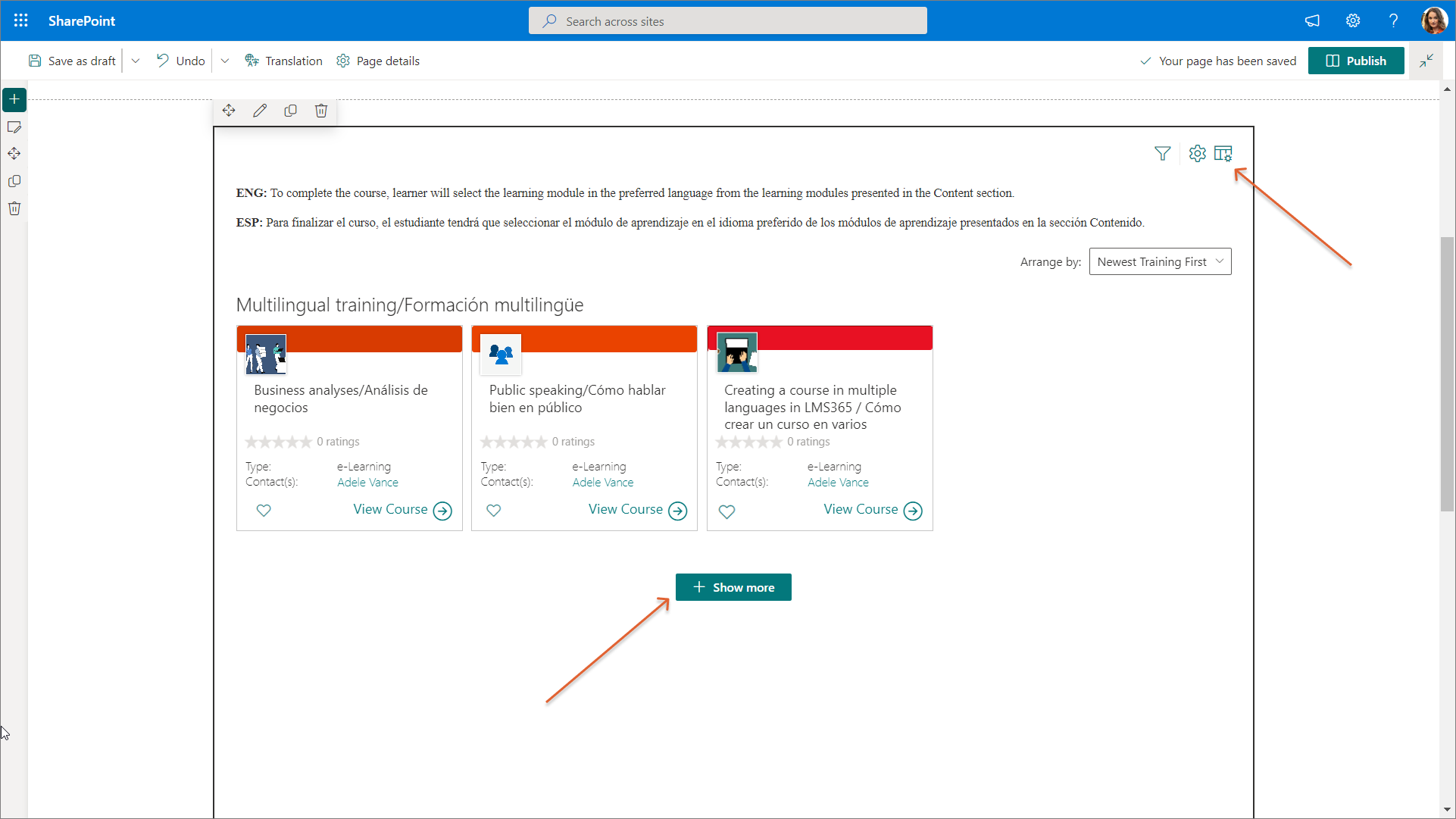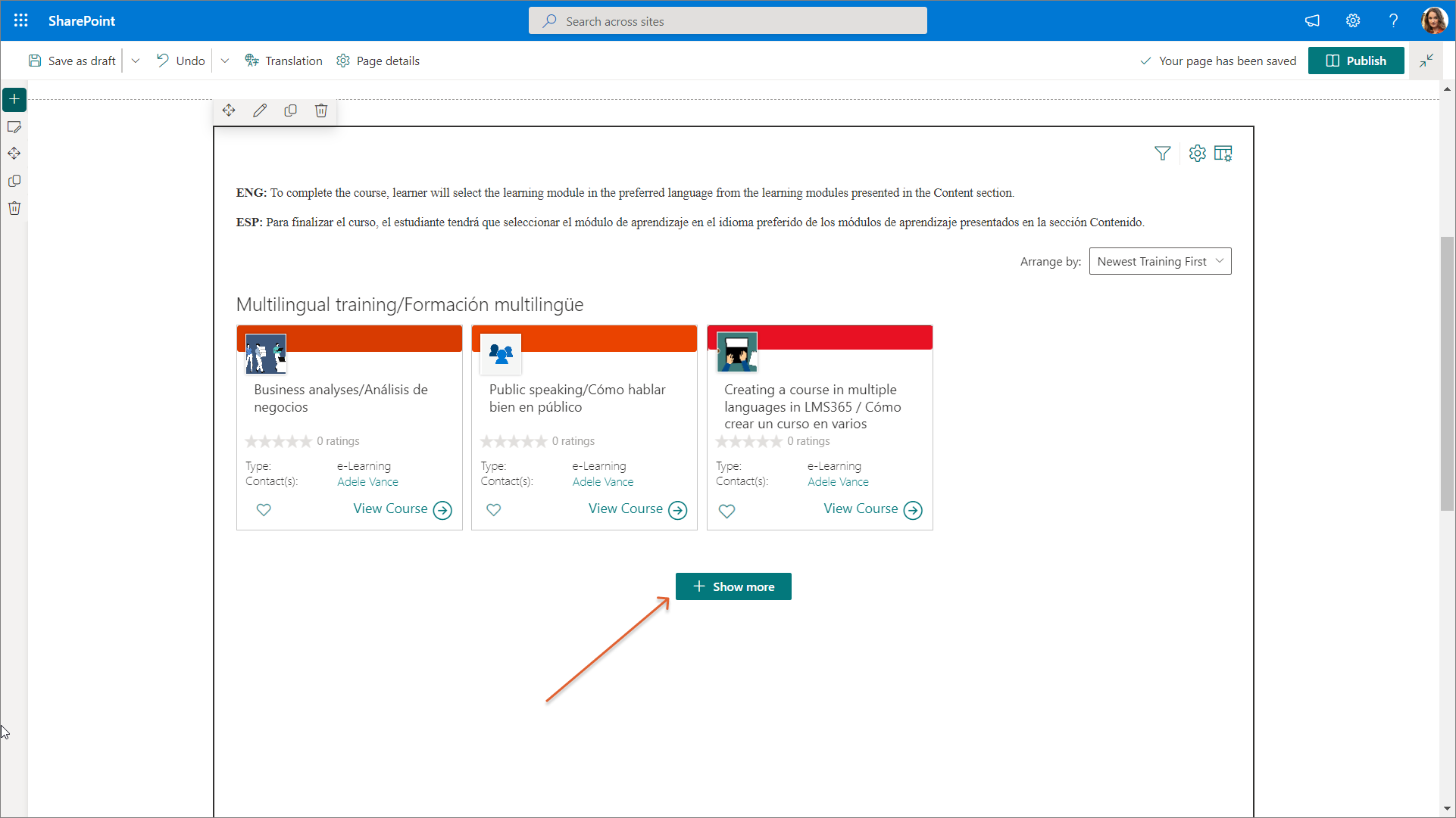 As a result, the Show more button isn't displayed on the customized Learn365 course catalog page. Therefore, learners will only see all the relevant courses and training plans on this one specific page.
