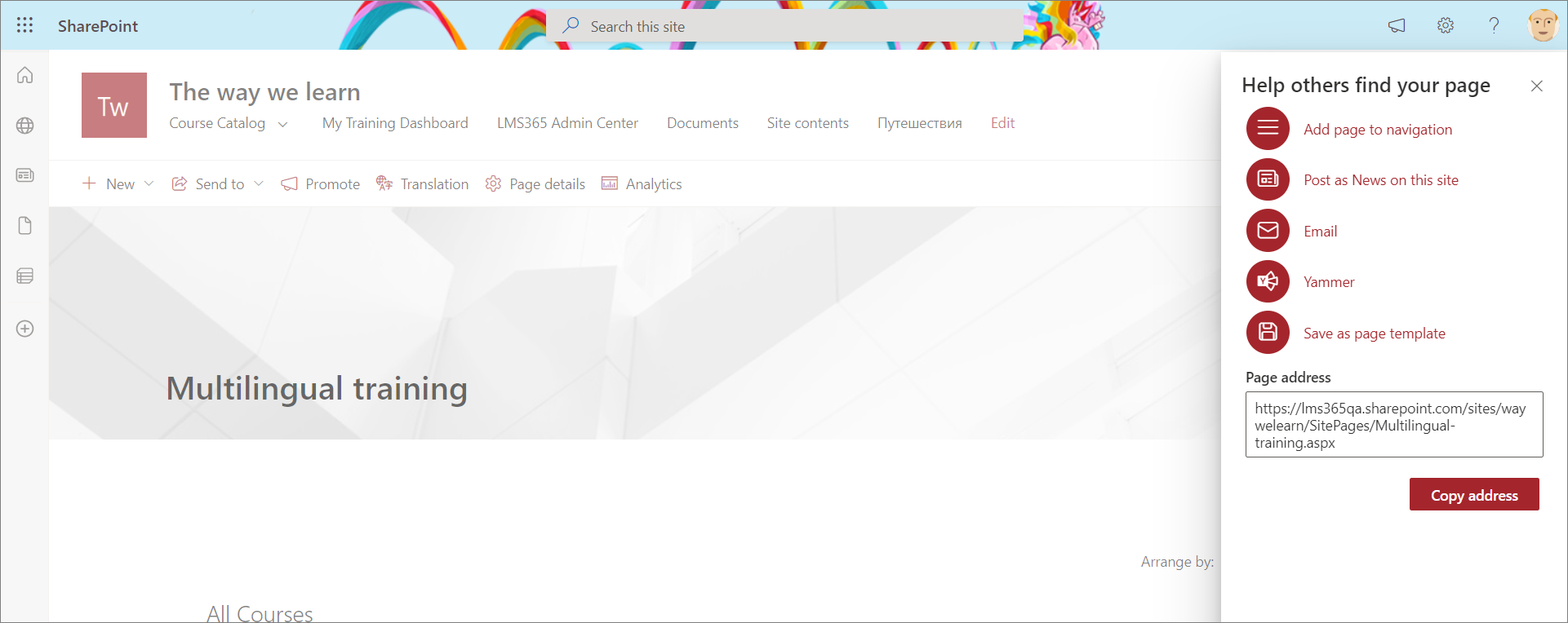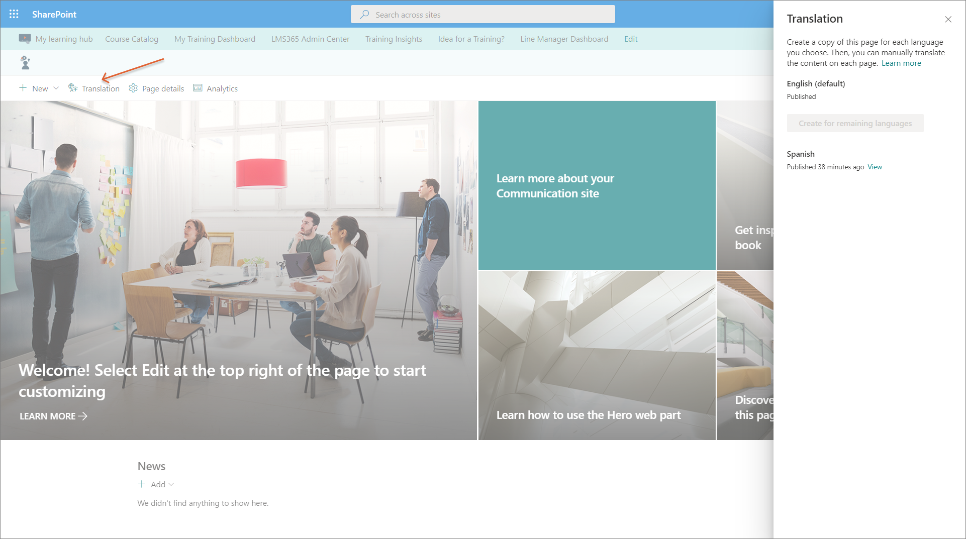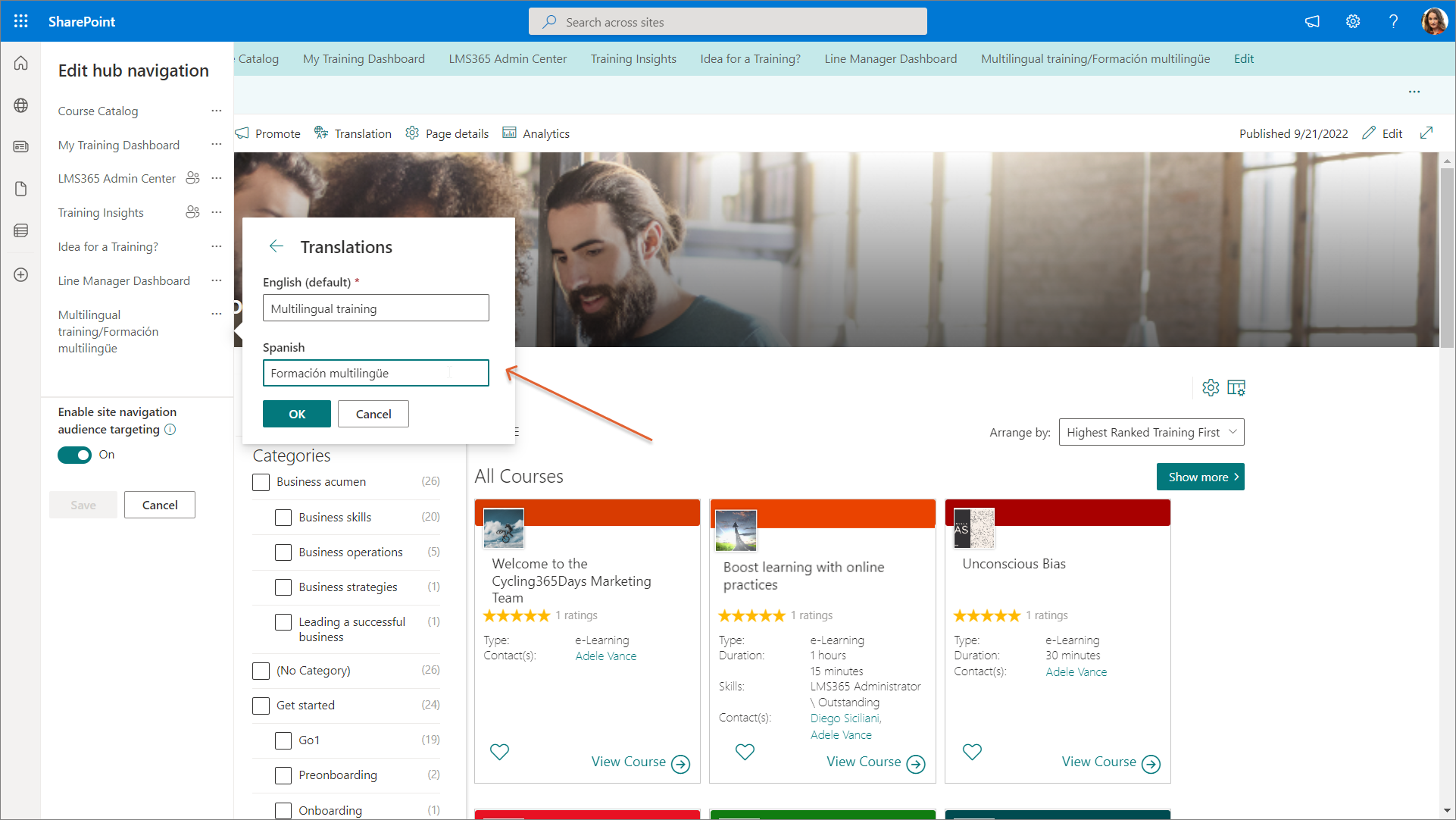 When the customized Learn365 course catalog page is published, you can make it available to learners by creating a direct link to it in the SharePoint site top navigation.
