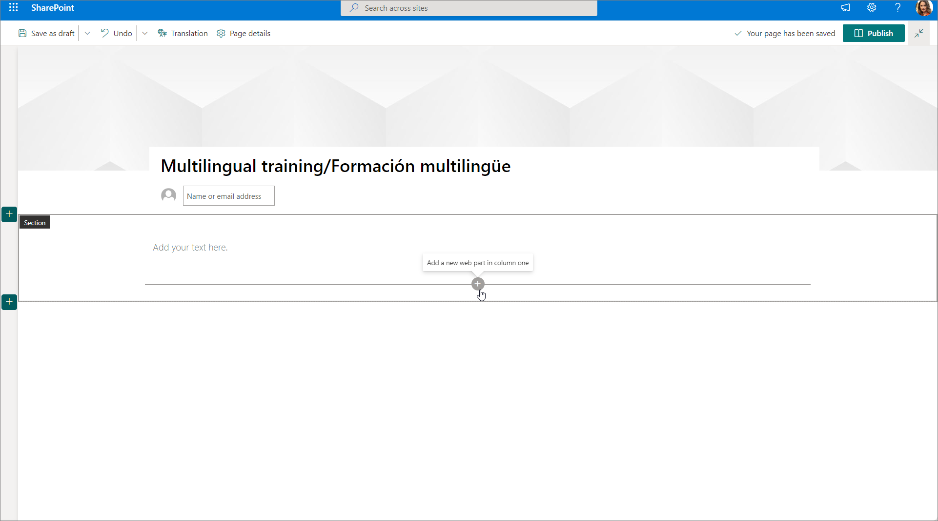 2. To create a custom Learn365 course catalog page, you must first add the LMS365 Course Catalog web part to the newly created page. Hover over the place where you want to add the web part and select the plus icon.