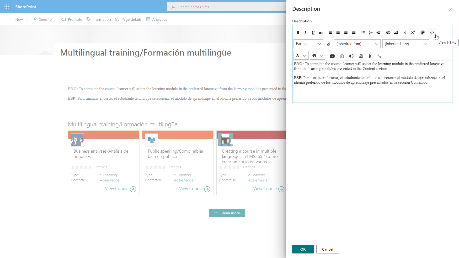 In this article, we go through the steps of creating a custom Learn365 course catalog page that displays a selection of courses with content in multiple languages.