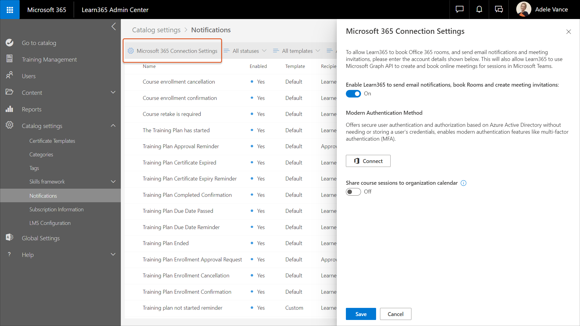 Role required to complete the step: To enable Learn365 to send notifications regarding training events, the catalog admin must first configure the Microsoft 365 Connection Settings of the catalog in question.