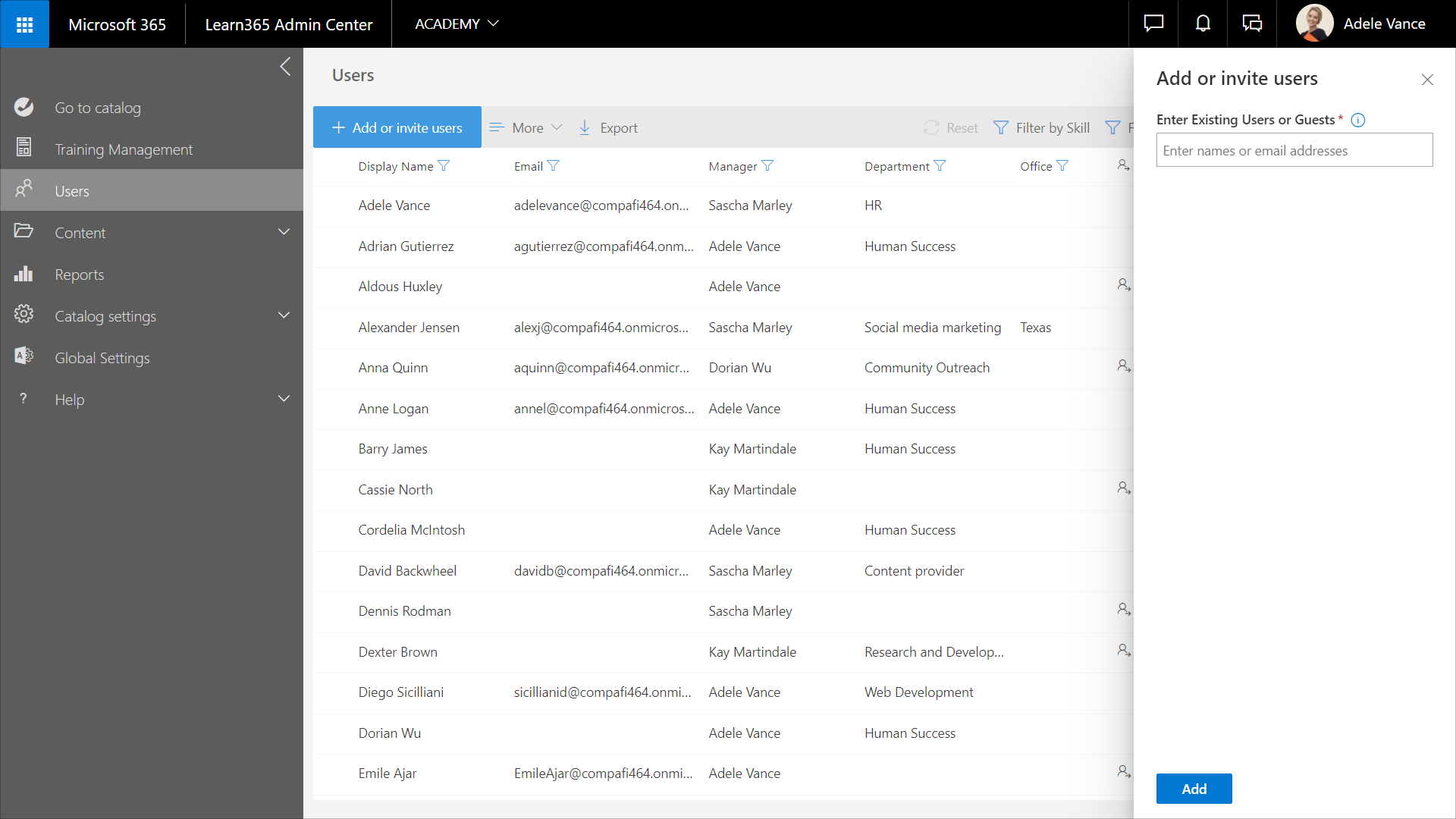 1. From the Learn365 Admin Center, at catalog level, go to Users > Add or invite users.