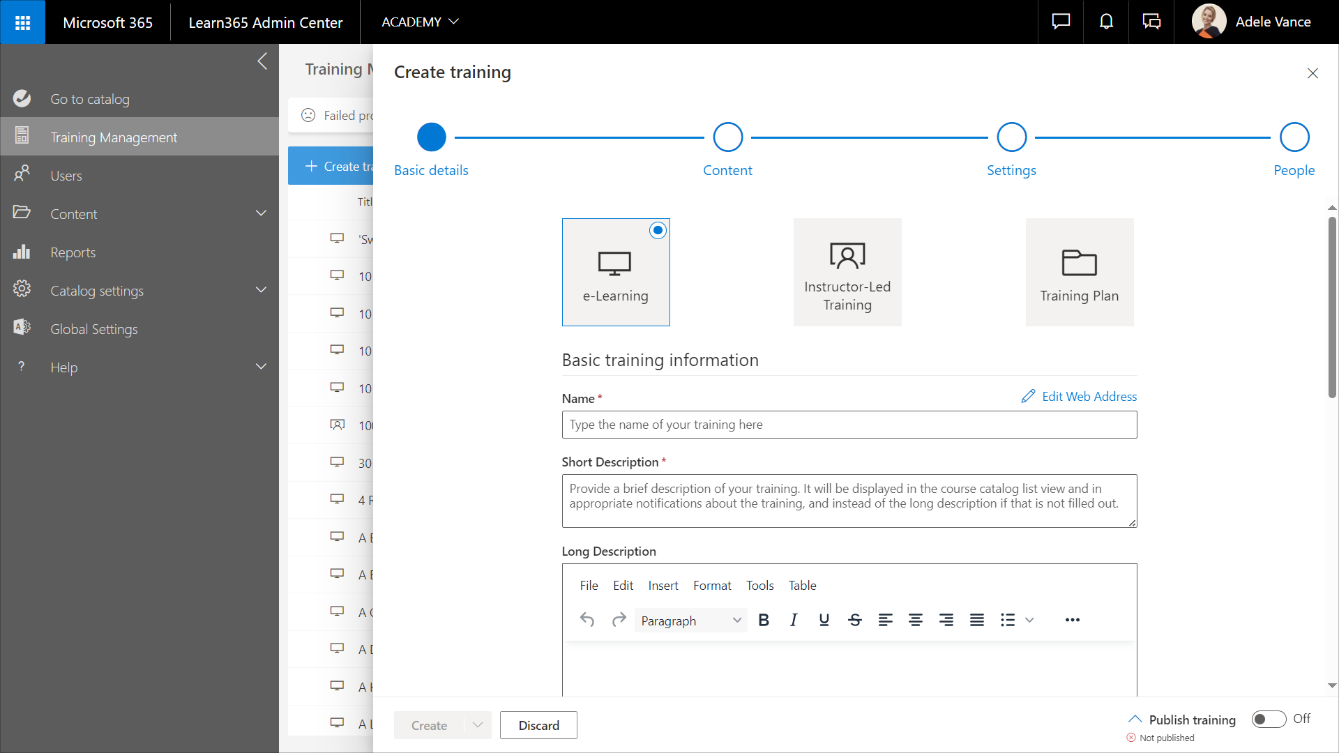1. From the Learn365 Admin Center, at catalog level, go to Training Management > Create training.