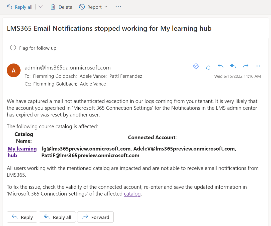 In the event that the connection between your Learn365 application and the account used for sending Learn365 email notifications in your organization is lost, catalog admins receive a corresponding email.
