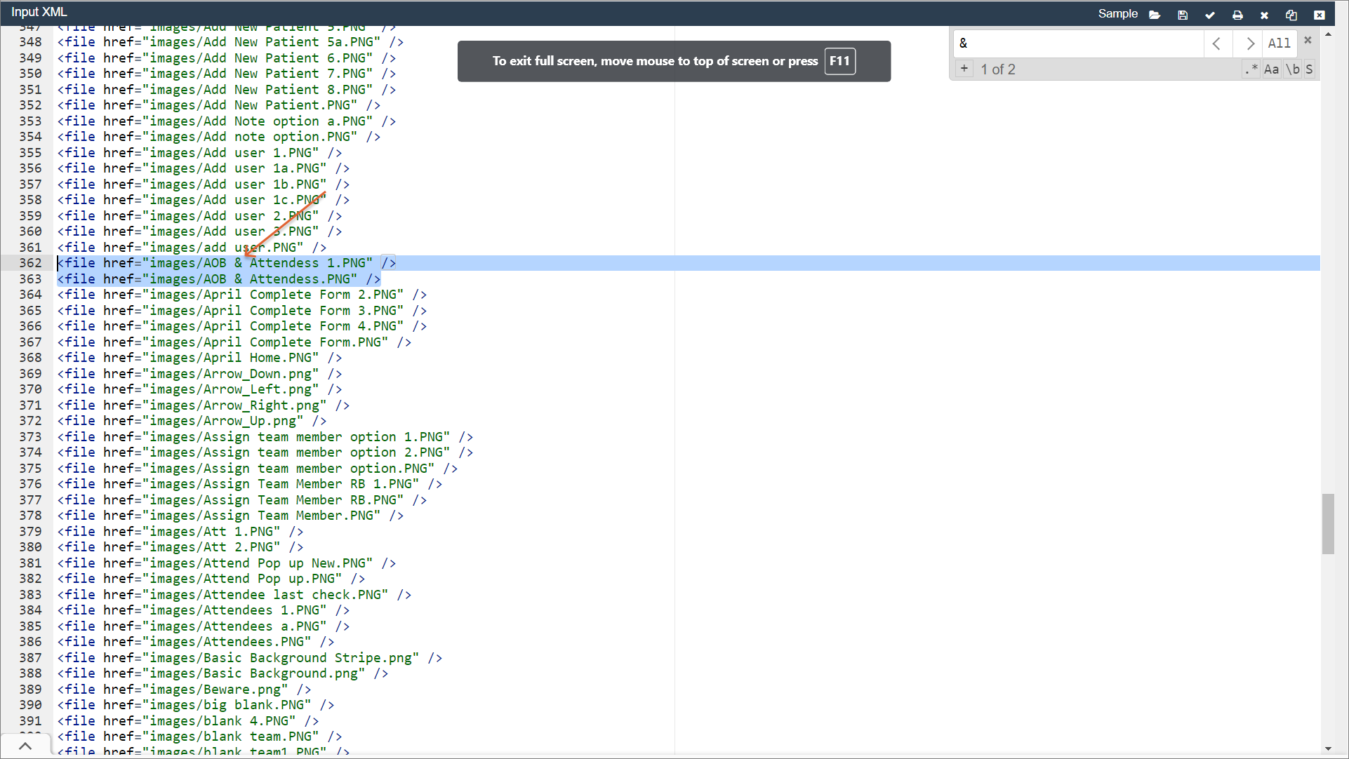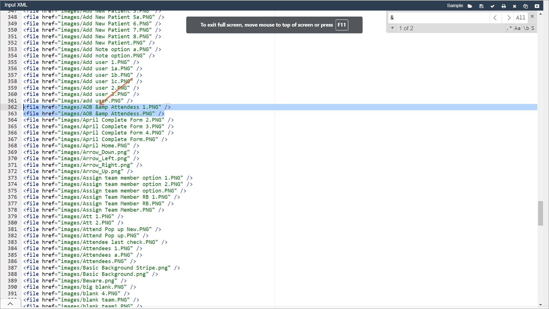 3. In the opened file, search for & symbols and replace each of them with &.