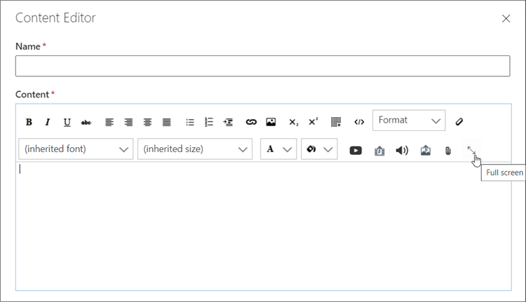 To allow the editor more space when editing the content, the Content field of the editor can now be expanded by selecting the Full-screen icon.
