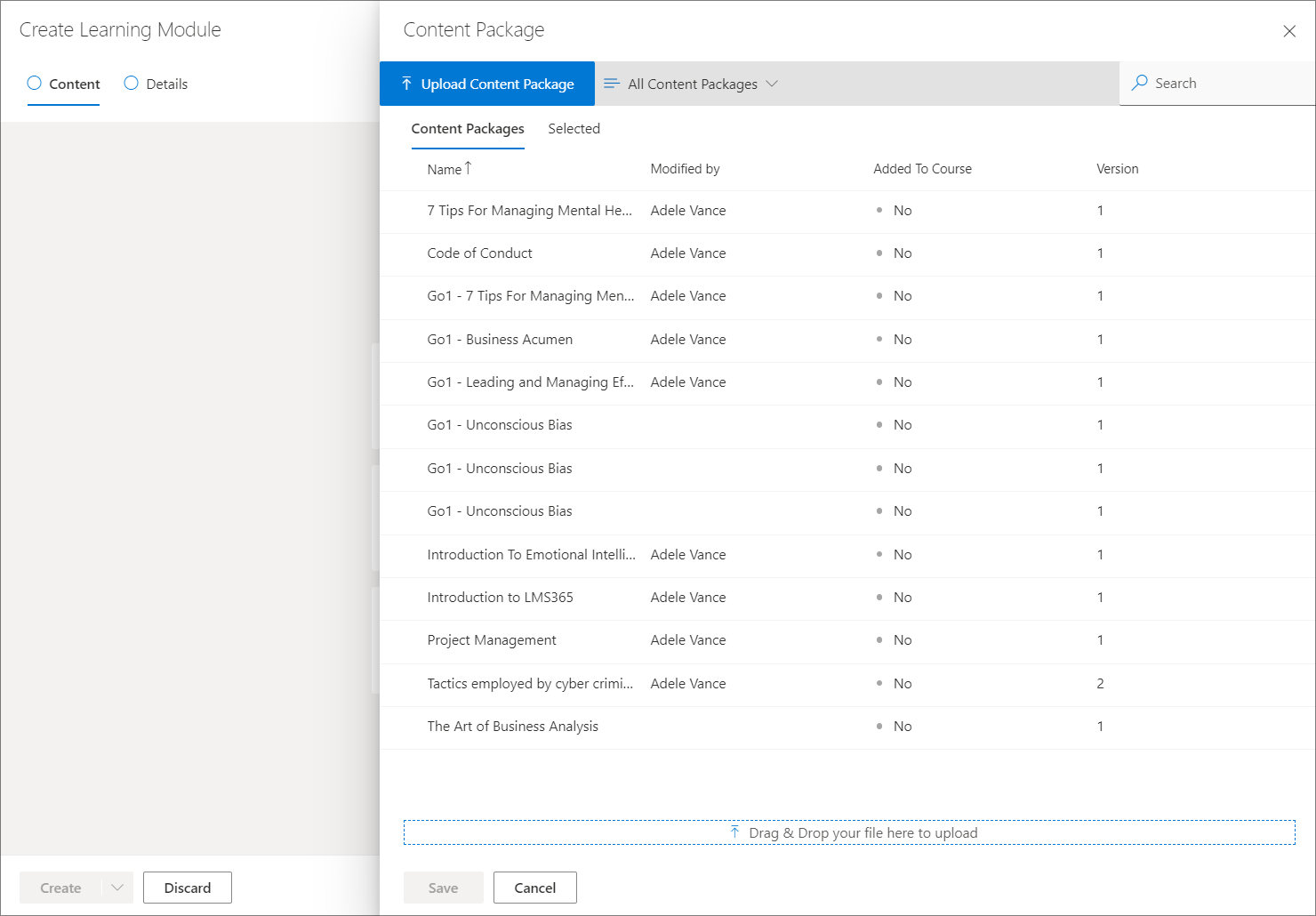 This option will allow you to add a content package to the learning module builder using drag and drop.