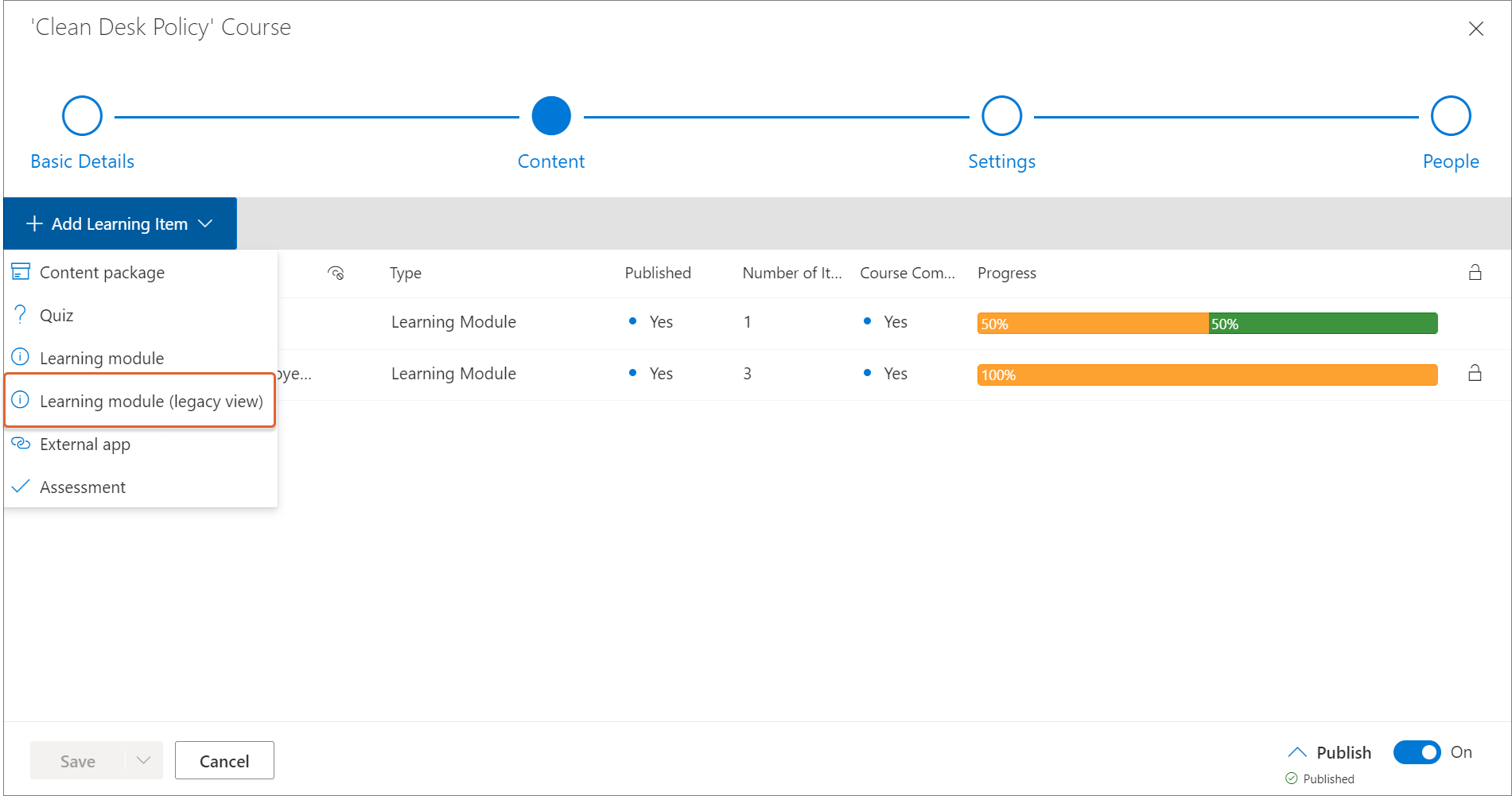 To provide a smooth transition period for this feature, admins can continue to use the original learning module create and edit interface via the Learning module (legacy view) option.