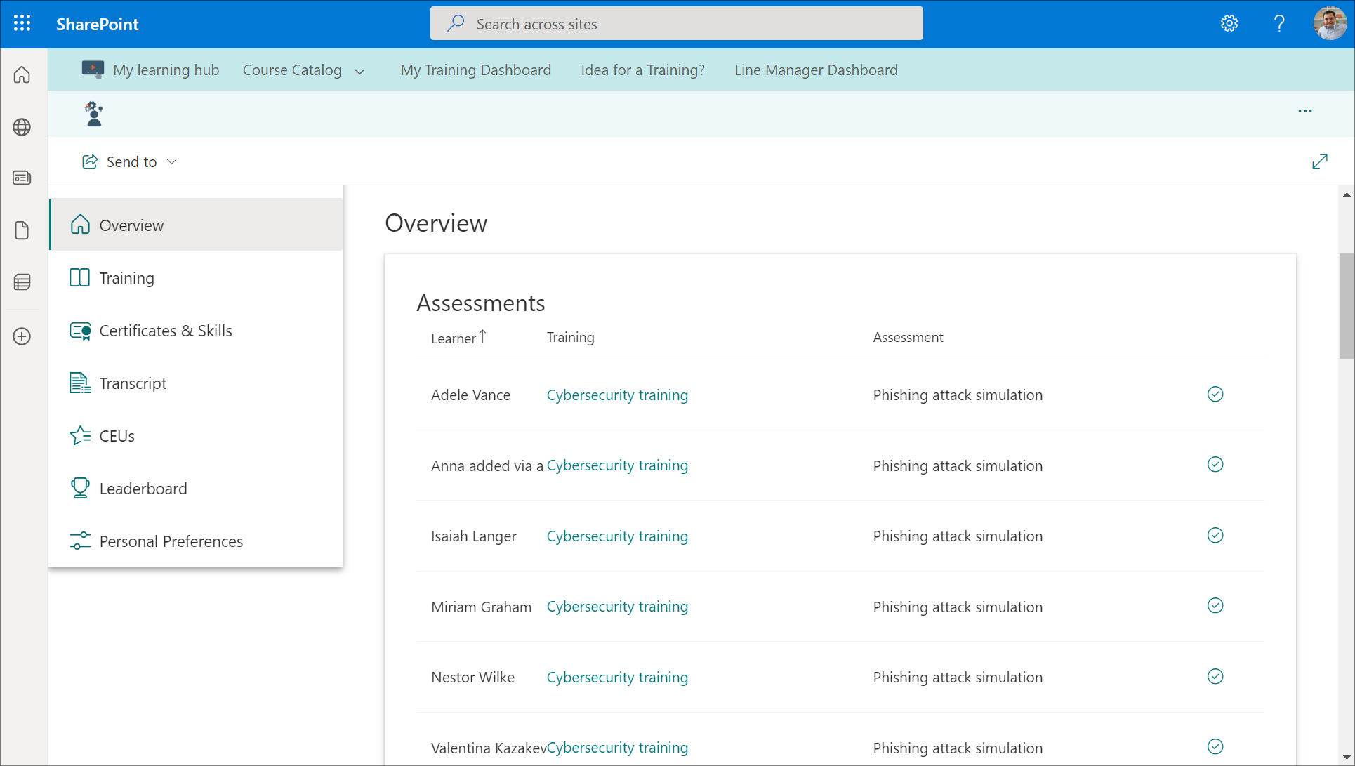 From the Overview section of My Training Dashboard, they will be able to see the list of learners to assess.