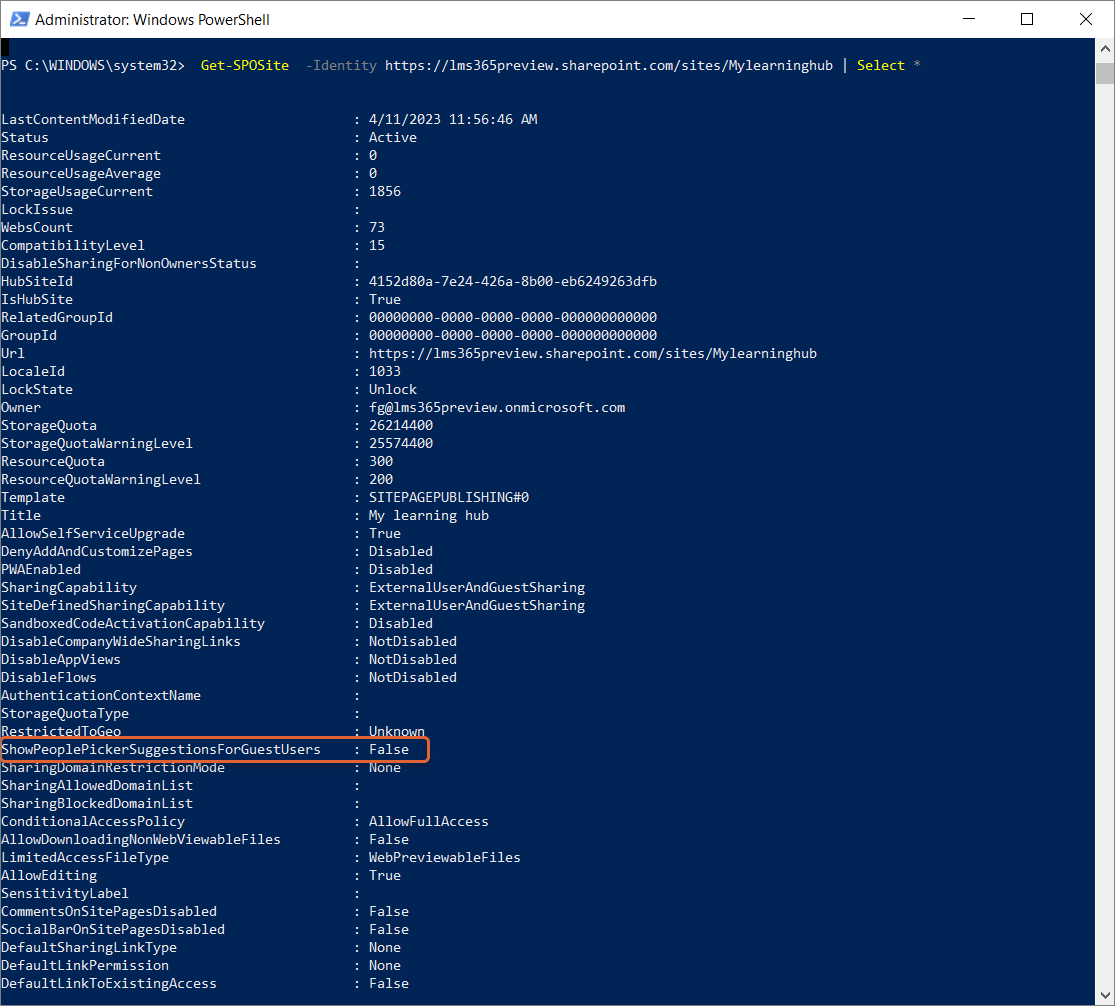 In the command results, check the ShowPeoplePickerSuggestionsForGuestUsers parameter. If the result is False, then this is the cause of the people picker issue in Learn365. By default, the ShowPeoplePickerSuggestionsForGuestUsers setting is toggled Off. This setting can be configured at tenant level and affects all catalogs of the tenant. Find more information about this command here.