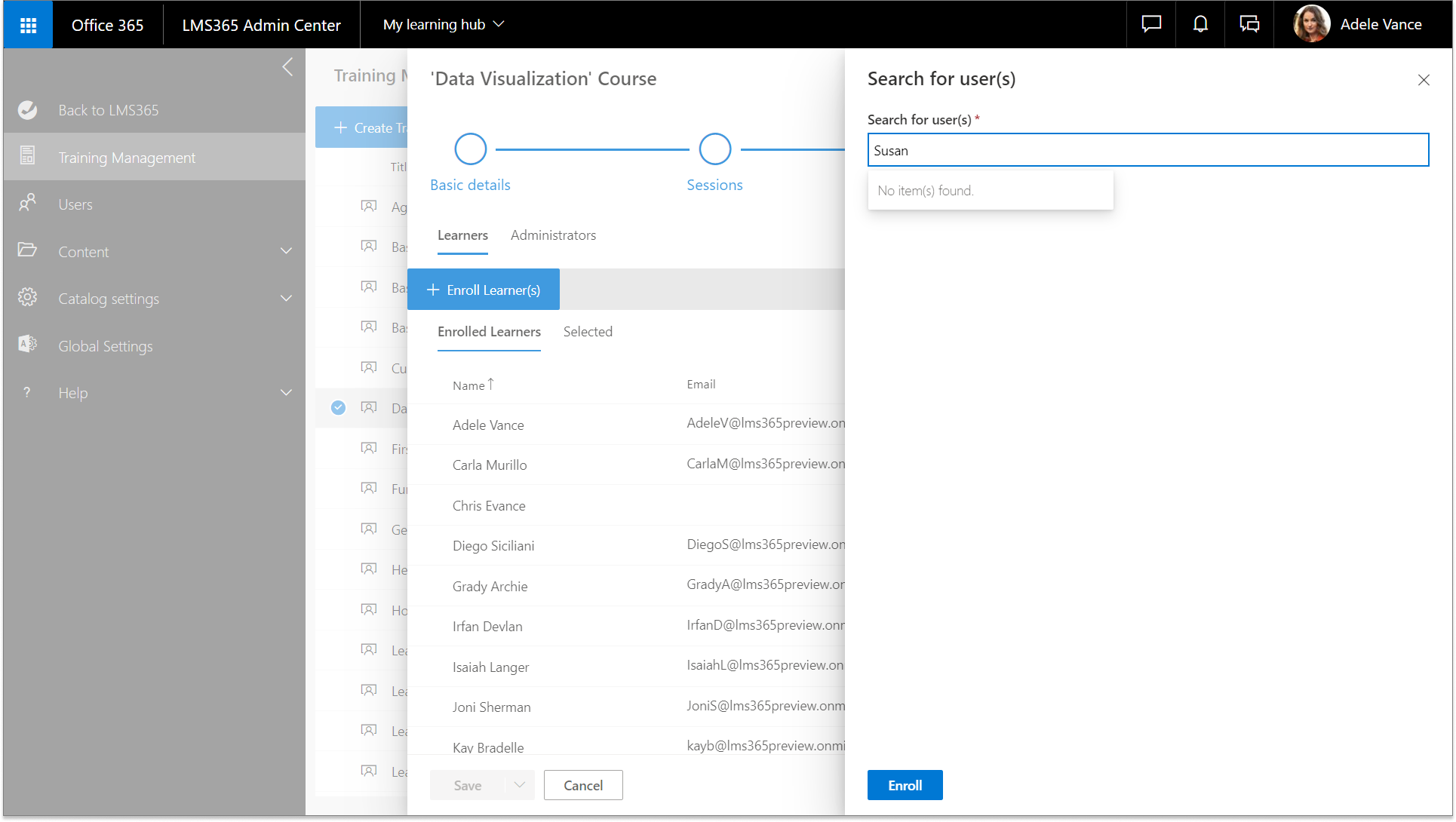 When adding users to courses and training plans, and when assigning training admins, the people picker may not find the relevant user. Instead, the No item(s) found message might be displayed.