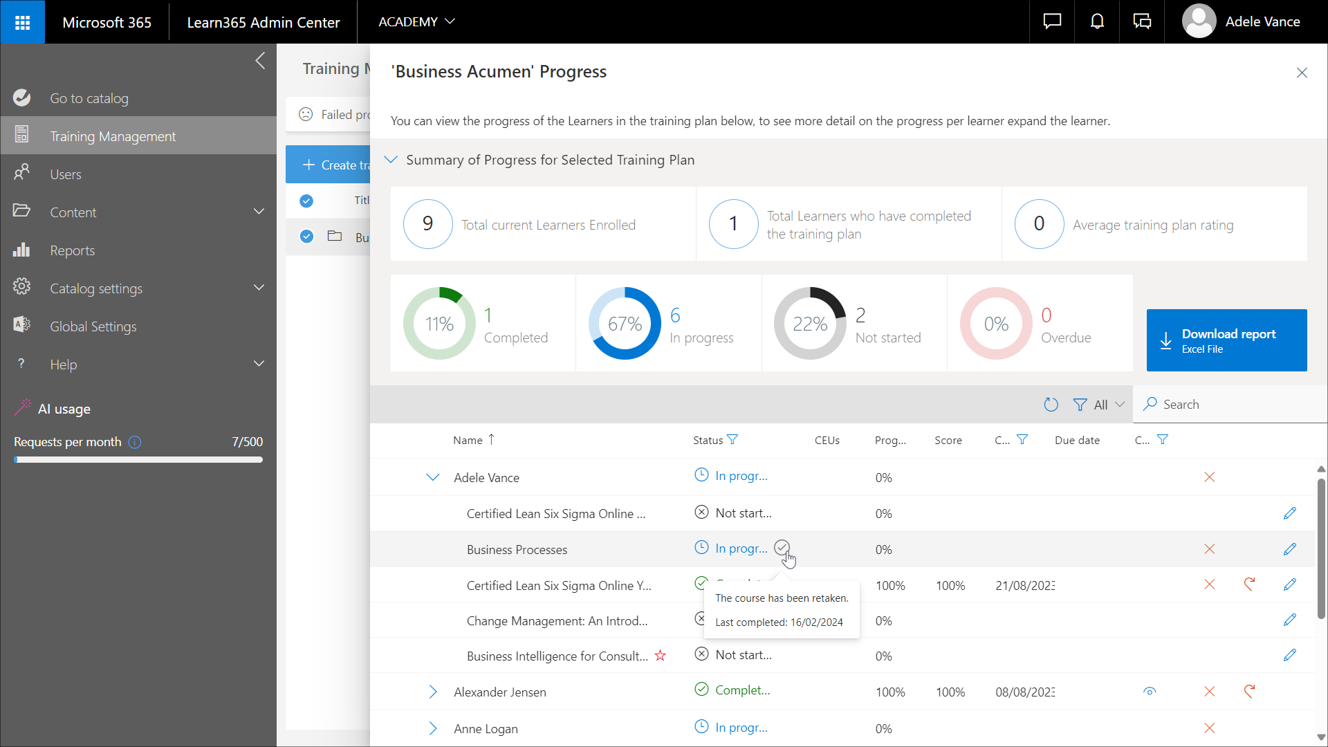 To track the most recent completion date of the training plan, if it was previously completed before the retake, refer to the Previously completed column in the Excel report.