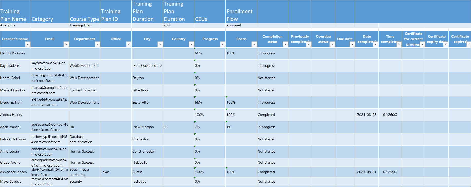 Displays additional information about learners enrolled in the training plan: Email, Department, Office, City, Country. The dashboard view doesn't contain this information.