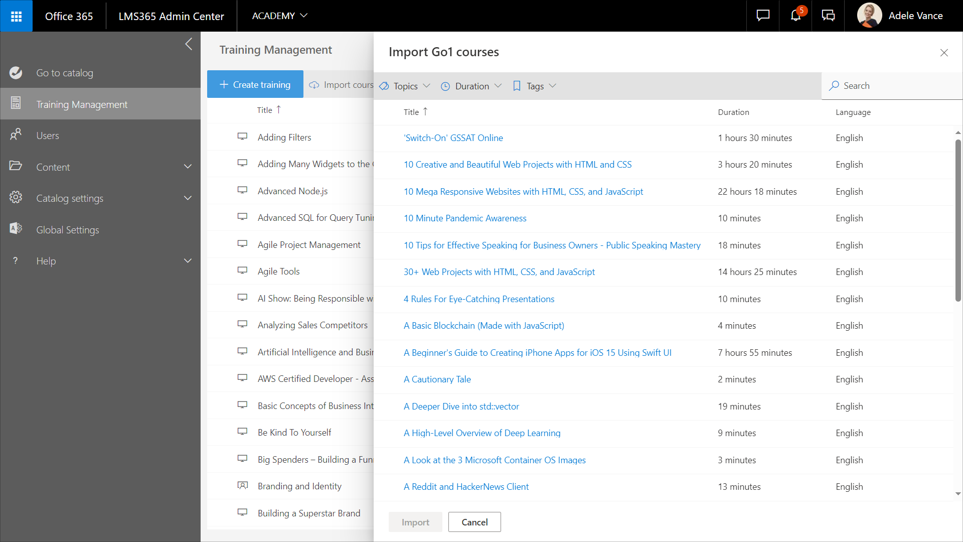 When the connection is established, you can import Go1 courses into Learn365 to include these courses in the selection of training available from your course catalog.