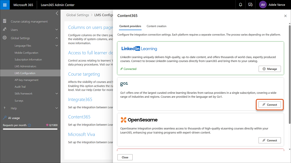 1. As an LMS admin, go to the Learn365 Admin Center > Global Settings > LMS Configuration > Content365 > select the Content providers tab > select Connect on the Go1 tile.