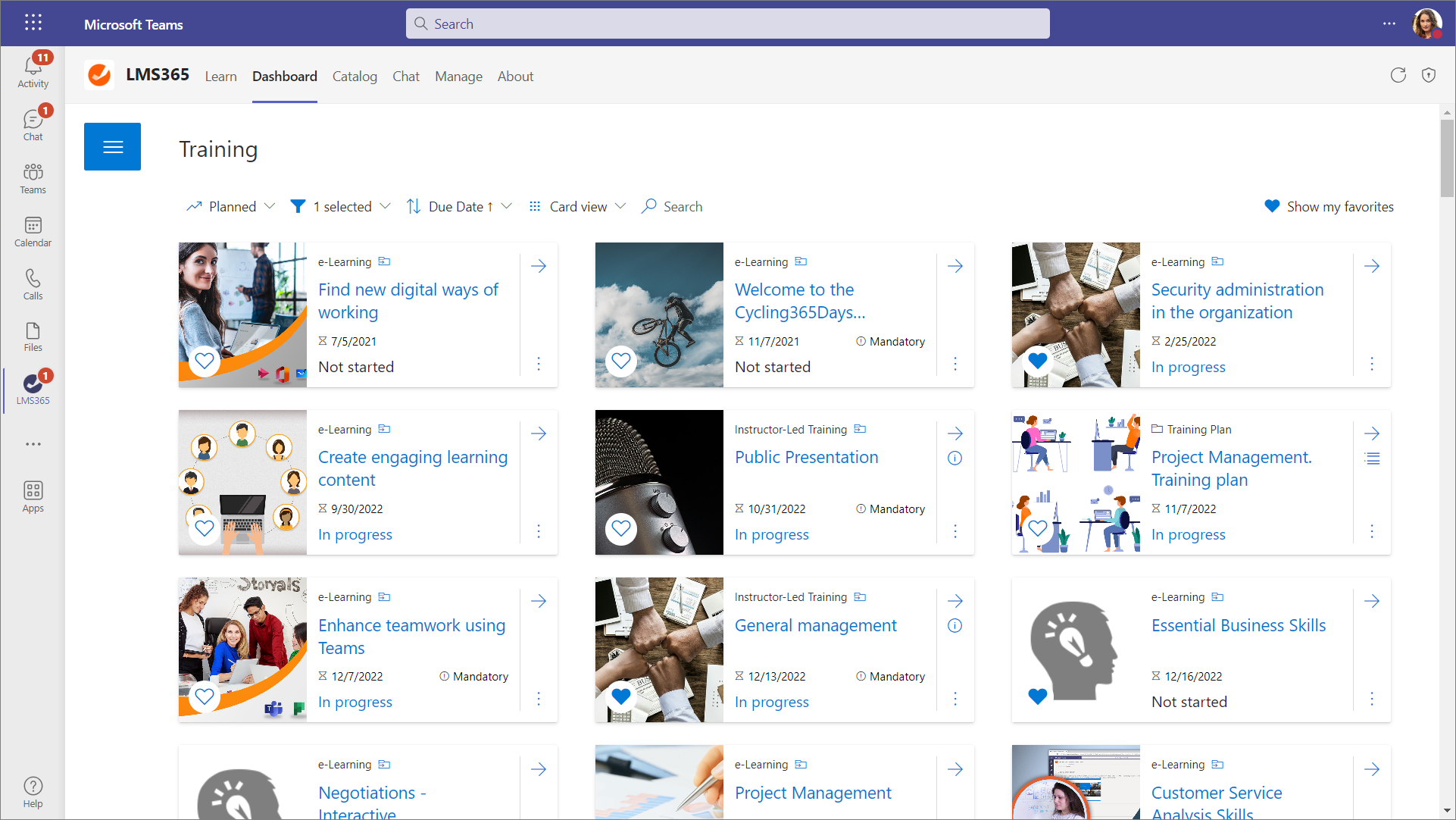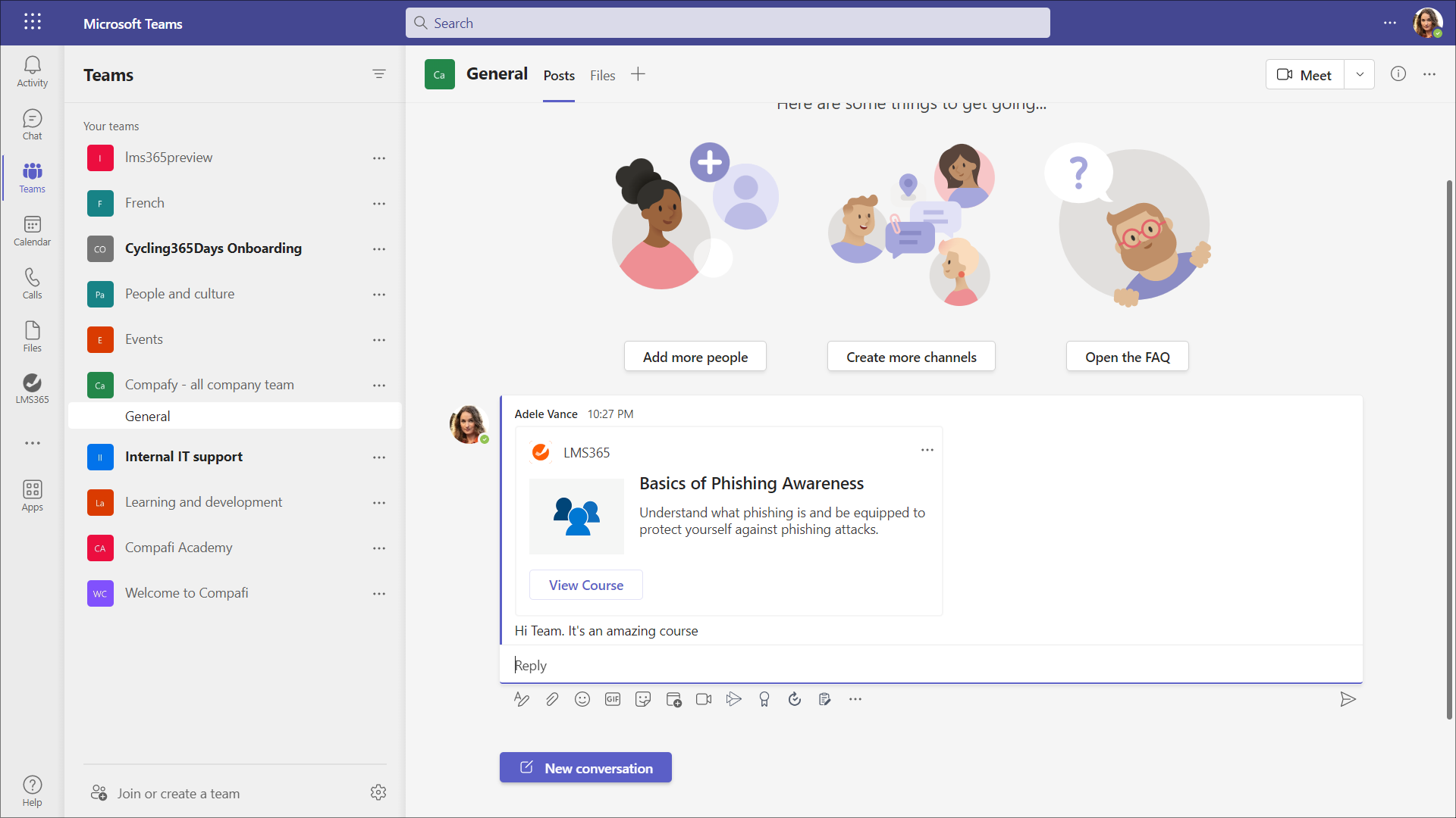 Microsoft Teams helps users find relevant Learn365 courses and training plans, then share them in Teams conversations. Find more information about how to share a course or training plan in Teams in this article.