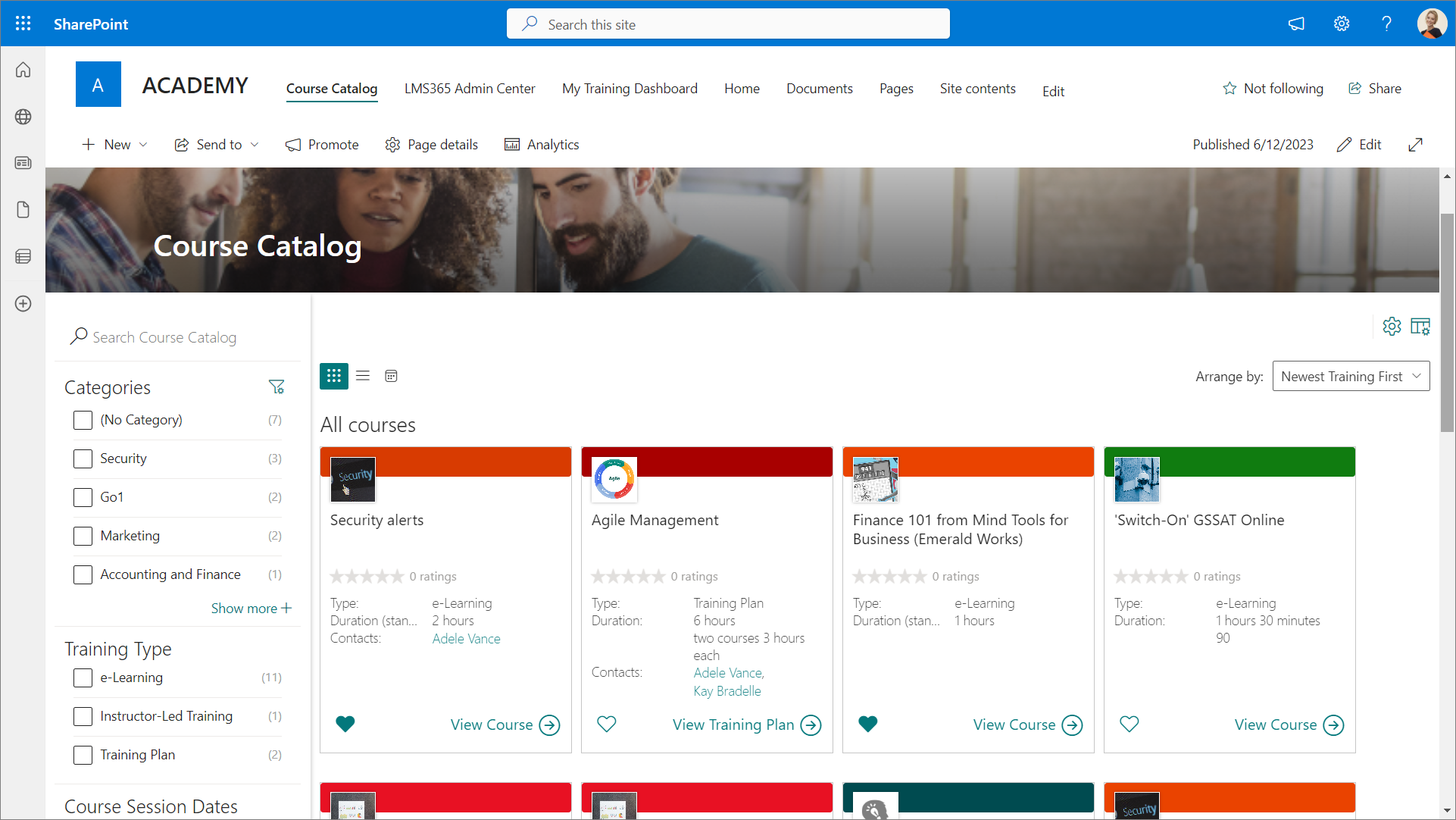 Once a catalog is created in Learn365, a home page is generated for the catalog. The catalog home page provides learners with an overview of all published and available courses and training plans in the catalog.
