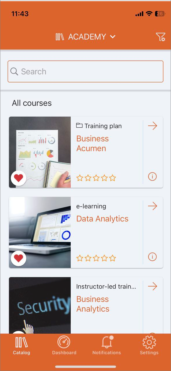 The catalog home page is a good place for users to get an overview of the available courses and training plans, search for relevant training, and start the learning experience.