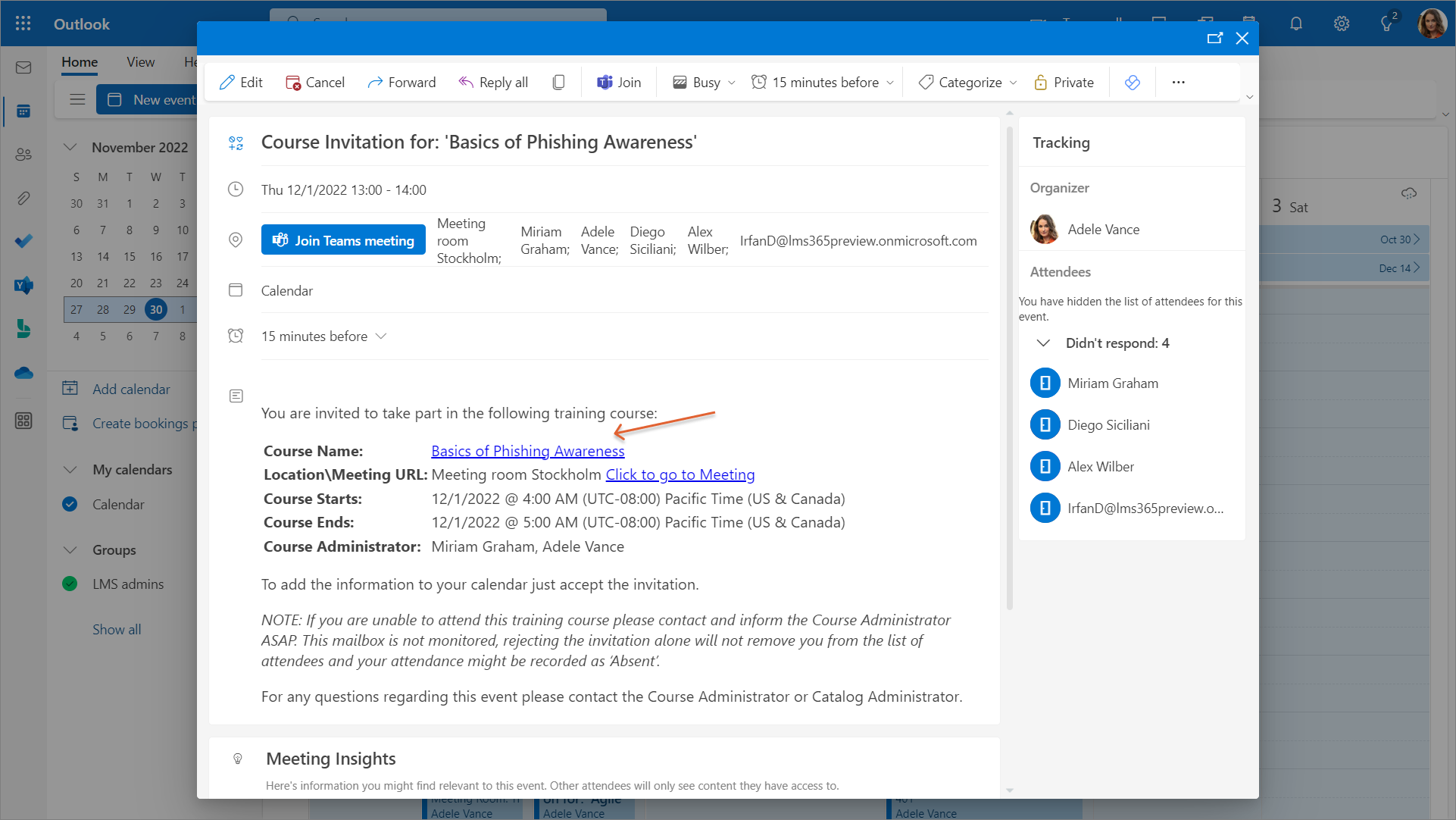 - If the catalog admin has enabled sharing of a course catalog calendar view in an organizations' shared Outlook calendar, the user will be able to find upcoming sessions on this calendar. When users view the calendar event, the title of the training acts as a direct link to the course home page. However, if the user doesn't have access to the course catalog, they won't be redirected to the course home page and won't be able to accept the invitation to the session.