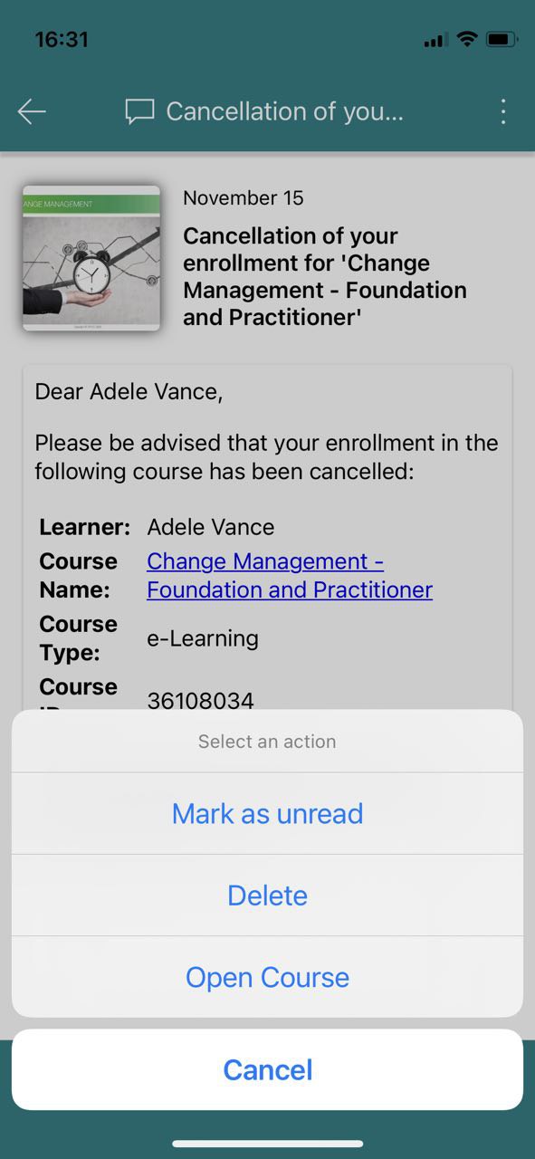 Learn365 enables notifications to be automatically sent to relevant users by email, Microsoft Teams notifications, as scheduled appointments, and as push notifications in the Learn365 mobile app.