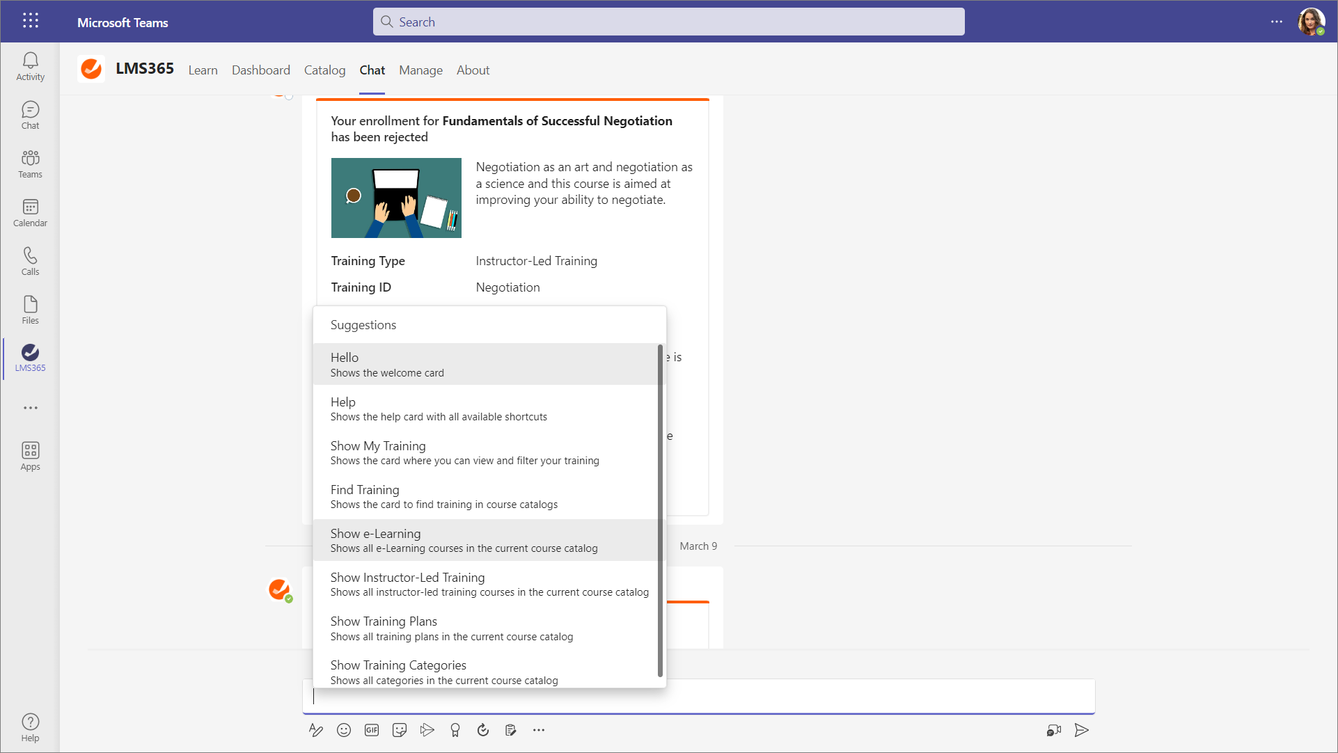 The Chat tab in the Learn365 app for Microsoft Teams helps users find courses and training plans via a conversation with the bot. The conversation with the bot is driven by a set of bot commands. Courses and training plans are displayed in training cards, enabling users to quickly access them.