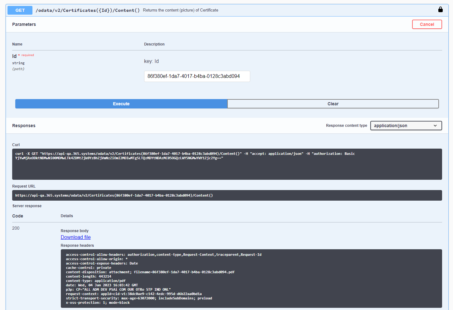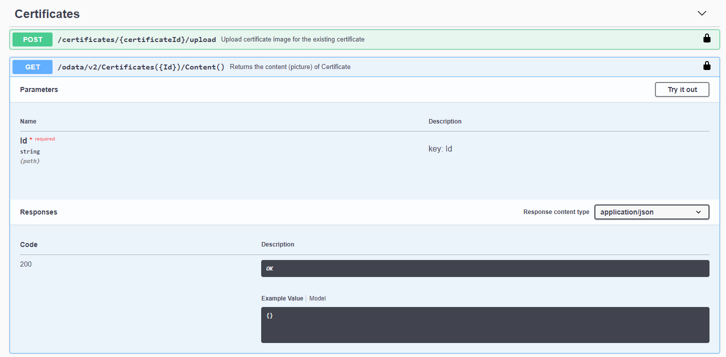3. Find the Certificates section, expand it, find the GET method /odata/v2/Certificates({Id})/Content() with the Returns the content (picture) of Certificate description, and select Try it out in the top right-hand corner.
