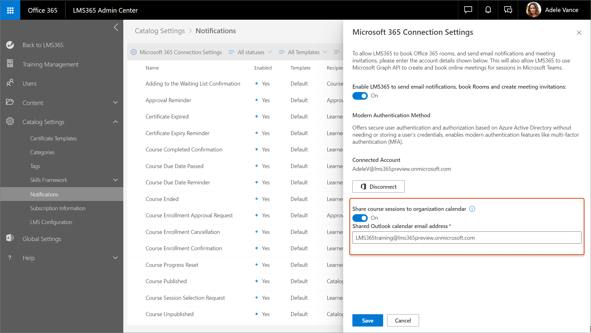 1. In the Learn365 Admin Center, go to Catalog settings in the navigation menu and select Notifications.